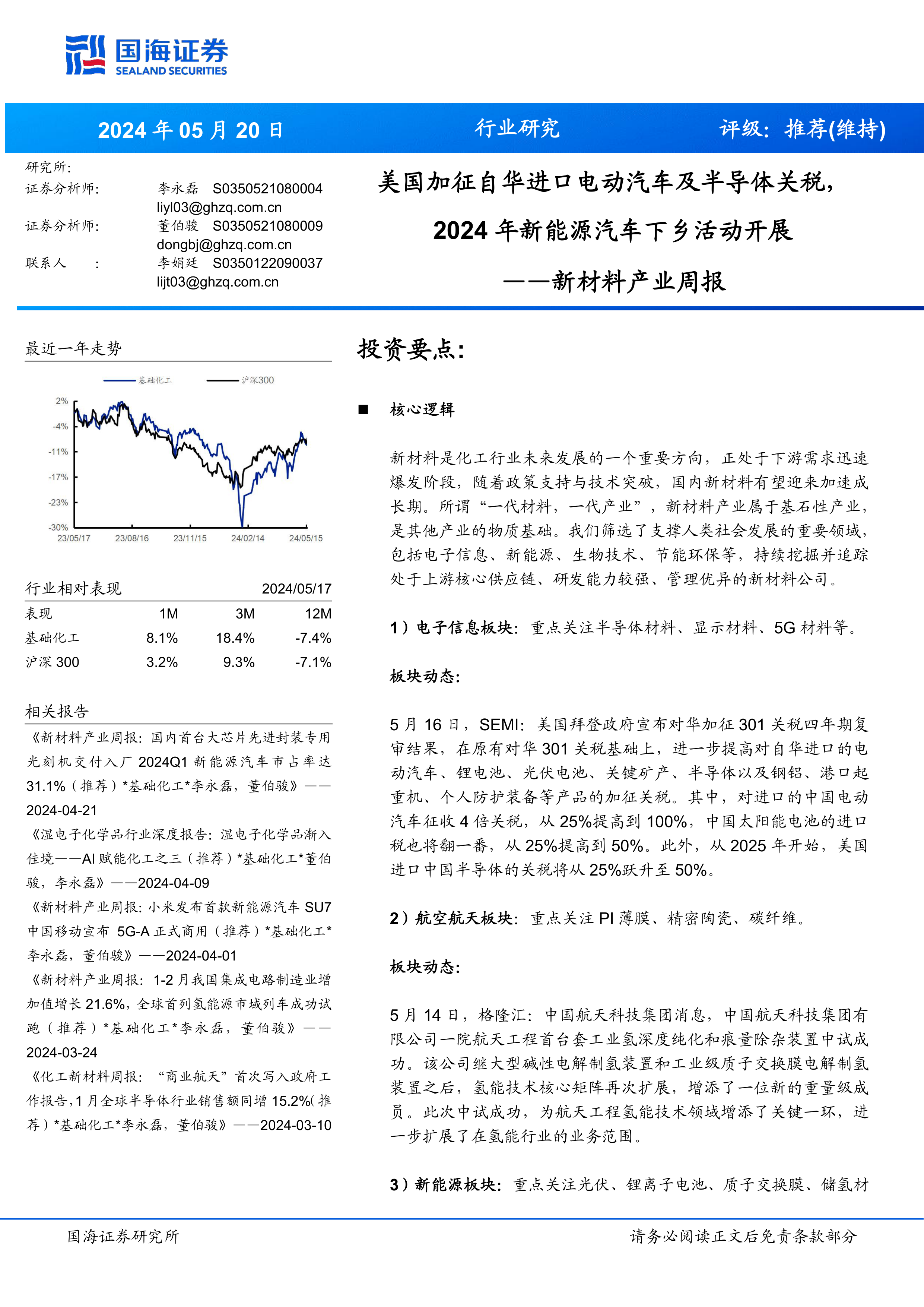 新材料产业周报:美国加征自华进口电动汽车及半导体关税,2024年新能源汽车下乡活动开展