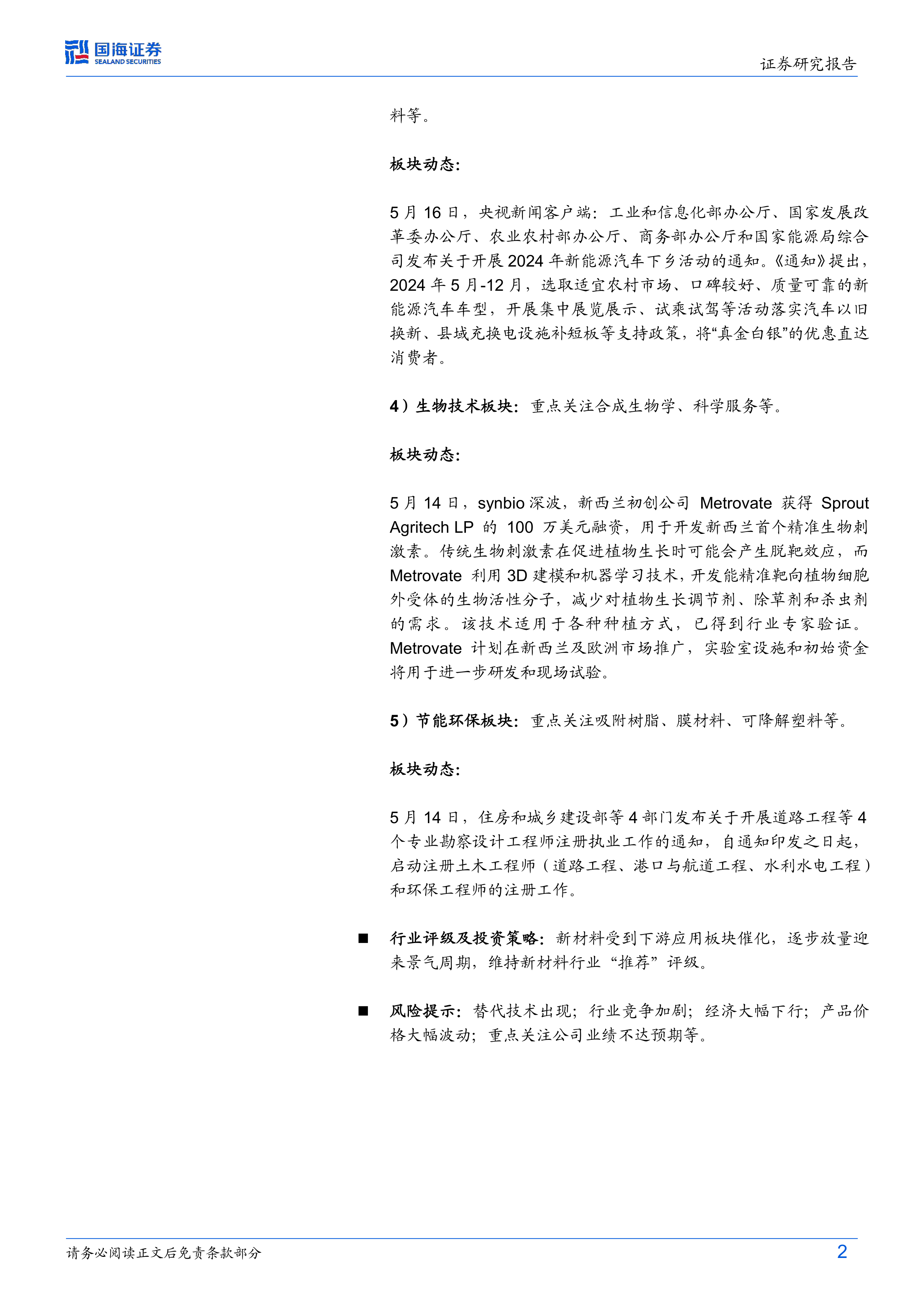 本报告基于公开数据和信息,对2024年5月新材料行业进行了全面分析。报告认为新材料行业发展前景向好,维持“推荐”评级,但需密切关注国际贸易环境变化、行业竞争加剧以及宏观经济波动等风险因素。报告中提供的各板块产业动态、关键数据和重点公司分析,为投资者提供了较为全面的行业信息和投资参考。 需要注意的是,报告中部分数据和预测来自Wind一致性预期,存在一定的不确定性。 投资者应结合自身情况,谨慎决策。