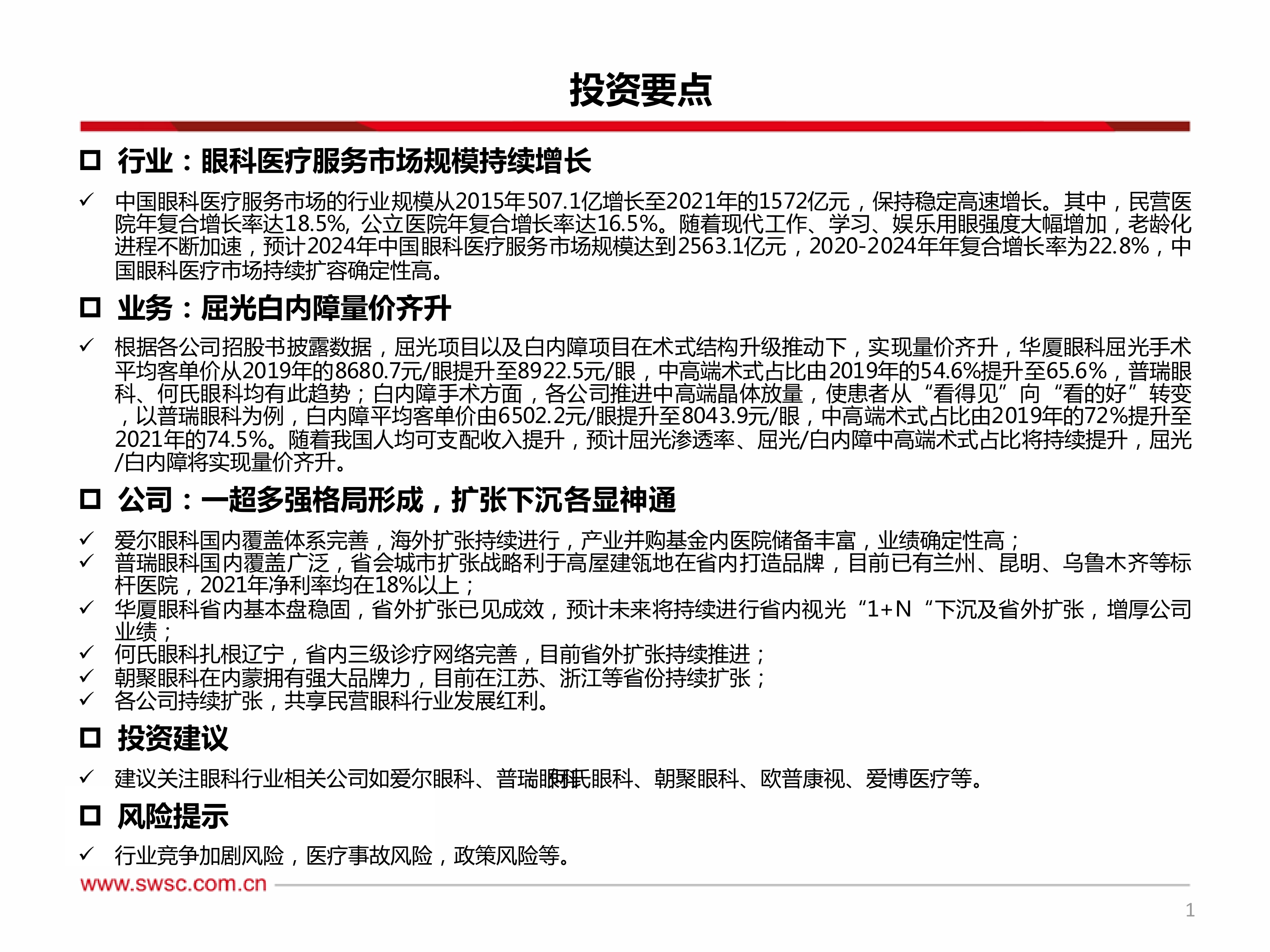 建议关注眼科行业相关公司如爱尔眼科、普瑞眼科、何氏眼科、朝聚眼科、欧普康视、爱博医疗等。