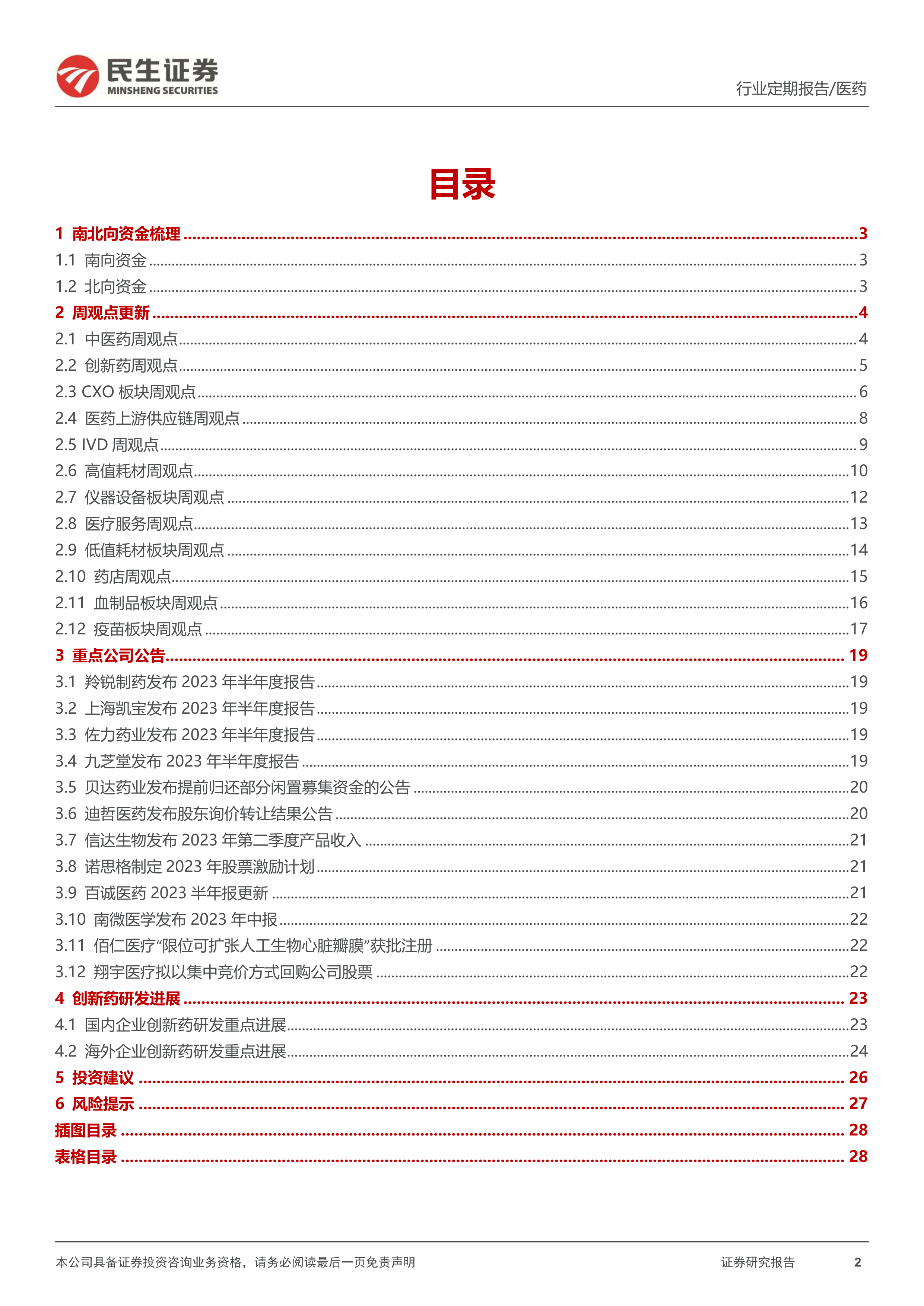 医药周观点:关注院外方向,包括CXO,周期底部、边际改善的原料药和低值耗材,OTC与药店,医药消费和医疗服务(包括眼科产业链等细分赛道机遇)。1)CXO:投融资有望企稳向上,看好下半年常规业务快速增长、新签订单环比改善,同时关注AI+药物发现领域和多肽产业链相关订单落地带来的投资机遇。我们看好全球投融资在下半年逐渐改善,药企和biotech的创新研发需求有望保持恢复,建议关注平台型龙头、细分领域龙头。2)低值耗材:关注GLP-1相关上游辅包材需求提升和潜在国产厂商切入供应链的机遇;关注疫后进入去库存供给逐渐出清的相关上游耗材领域。3)中医药:重点关注院外OTC方向的龙头企业,关注个股业绩释放节奏及重点品种落地节奏。4)药店:关注门诊统筹相关政策在各区域落地情况及相关影响,后续随着门诊统筹在各个区域落地,我们预计药店将迎来更多的处方外流。5)血制品:血制品属于国家战略资源,国企化进程不断推进,同时2023年二季度伴随院内复苏有望实现批签发和销售量的恢复,关注下半年行业供给与需求双重景气度提升。6)疫苗:随着新冠疫苗影响出清,需求恢复性提升,国内疫苗行业有望进入新景气周期。关注新品种放量节奏。7)医疗服务:建议重点关注消费医疗方向,此外关注刚性医疗服务,具备较高的业绩韧性,考虑到下半年属于传统医疗旺季,且部分公司估值处于历史低位。8)创新药:重点关注具有明确临床疗效及优势的刚需药品持续放量,关注板块回调机会。9)医药上游供应链:创新药行情回暖,叠加国内复工复产+海外市场开拓,带动生科链板块业绩+估值修复,关注下半年制药工业端大订单落地节奏。10)IVD:化学发光技术壁垒高,国产化率低,伴随集采政策逐步推广落地、分级诊疗政策进一步推动,有望加速进口替代,提升检测渗透率。11)高值耗材:集采政策推进节奏短期加速,医药领域反腐整治进入推进阶段,但我们认为对院内手术量的短期影响有限(高值耗材对应的手术刚性强),并将在长期驱动行业健康发展,内外因素扰动不改高耗行业向上态势,关注全年择期手术复苏及集采落地后国产替代加速两大方向,重点关注吻合器、电生理等集采执标后手术渗透率及国产化率有望出现显著边际变化的细分领域,及疫后复苏增长有望超预期的康复和介入瓣领域。12)仪器设备:关注政策落地进展和国产替代进度,关注下半年国内环保、高校和科研、工业等领域订单释放、改善节奏。