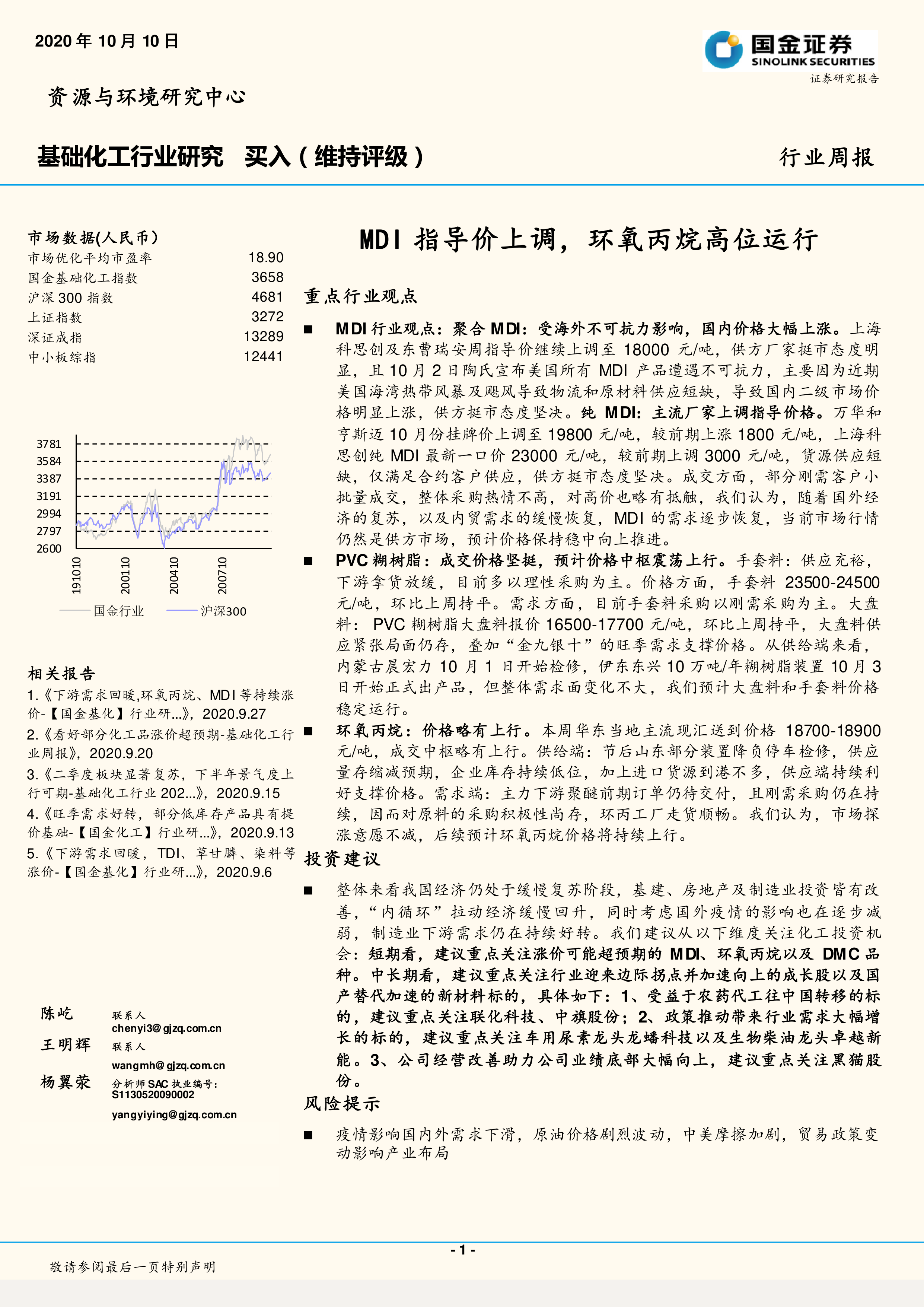 本报告涵盖了2020年10月10日基础化工行业周报的主要内容,包括市场数据、重点行业观点、投资建议和风险提示等方面。