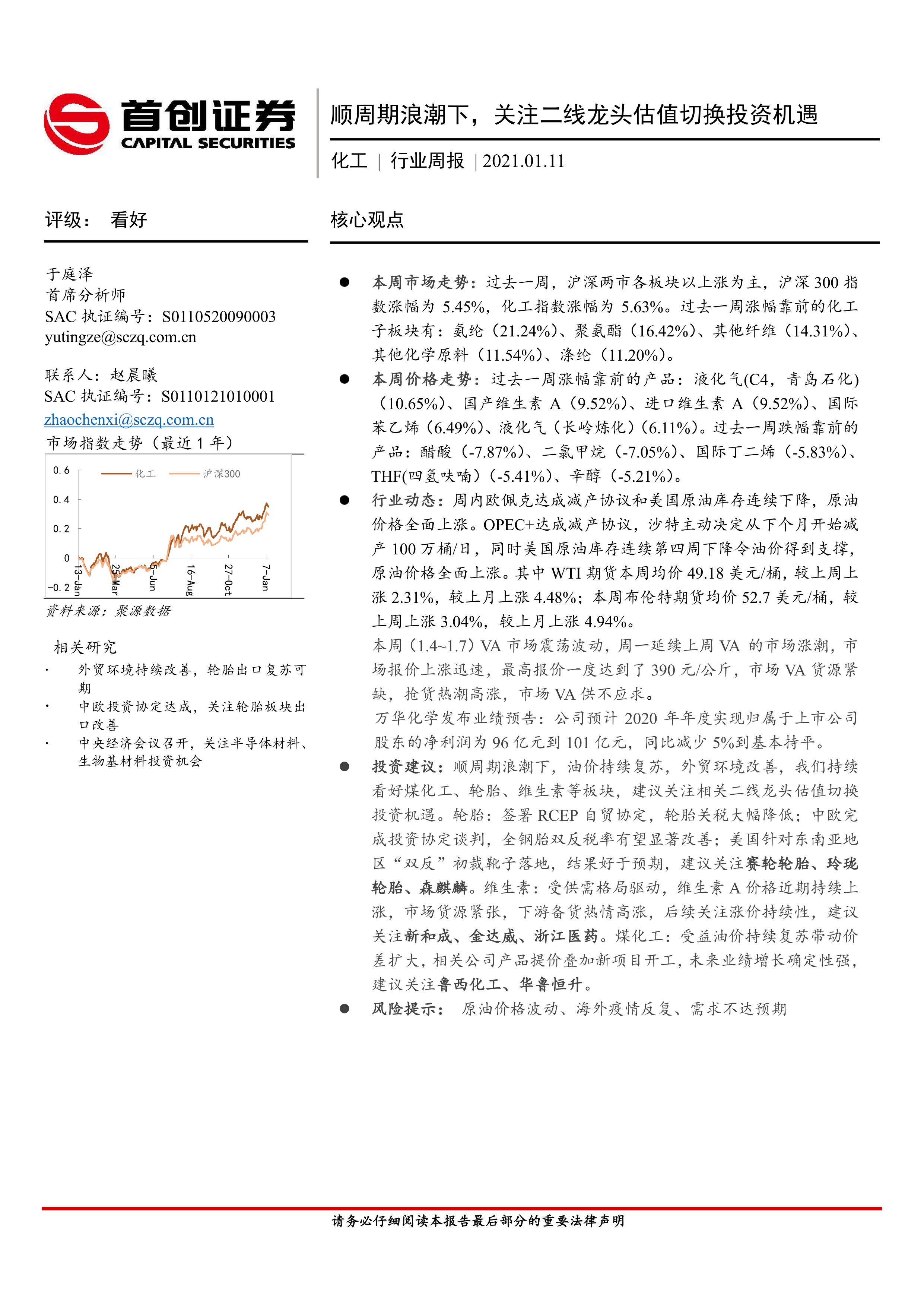 投资建议: 顺周期浪潮下,油价持续复苏,外贸环境改善,我们持续看好煤化工、轮胎、维生素等板块,建议关注相关二线龙头估值切换投资机遇。 轮胎:签署 RCEP 自贸协定,轮胎关税大幅降低; 中欧完成投资协定谈判, 全钢胎双反税率有望显著改善; 美国针对东南亚地区“双反”初裁靴子落地,结果好于预期, 建议关注赛轮轮胎、 玲珑轮胎、 森麒麟。维生素:受供需格局驱动, 维生素 A 价格近期持续上涨, 市场货源紧张,下游备货热情高涨,后续关注涨价持续性,建议关注新和成、金达威、浙江医药。煤化工:受益油价持续复苏带动价差扩大,相关公司产品提价叠加新项目开工,未来业绩增长确定性强,建议关注鲁西化工、华鲁恒升。