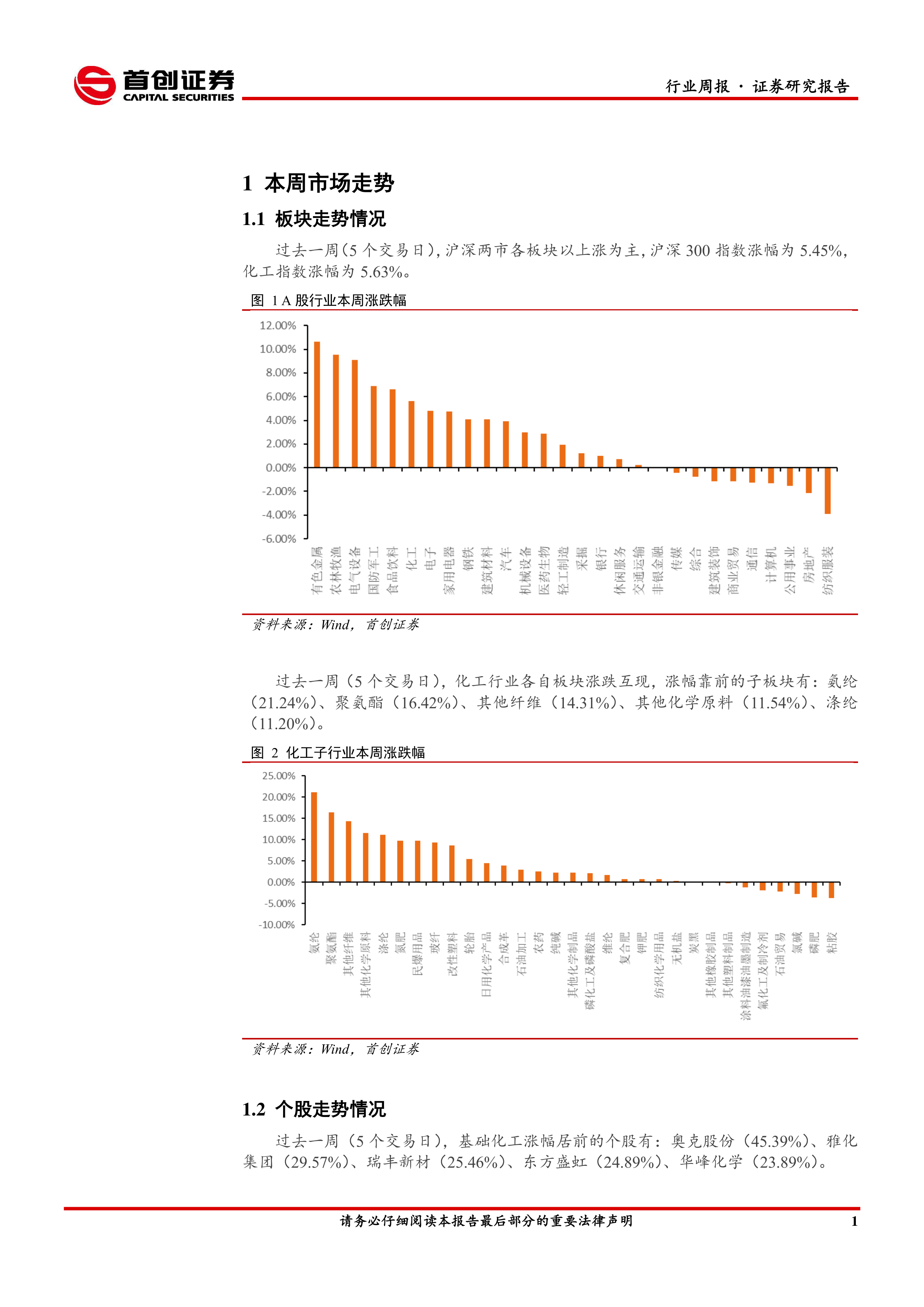 本周市场走势: 过去一周,沪深两市各板块以上涨为主,沪深 300 指数涨幅为 5.45%,化工指数涨幅为 5.63%。过去一周涨幅靠前的化工子板块有:氨纶( 21.24%)、聚氨酯( 16.42%)、其他纤维( 14.31%)、其他化学原料( 11.54%)、涤纶( 11.20%)。