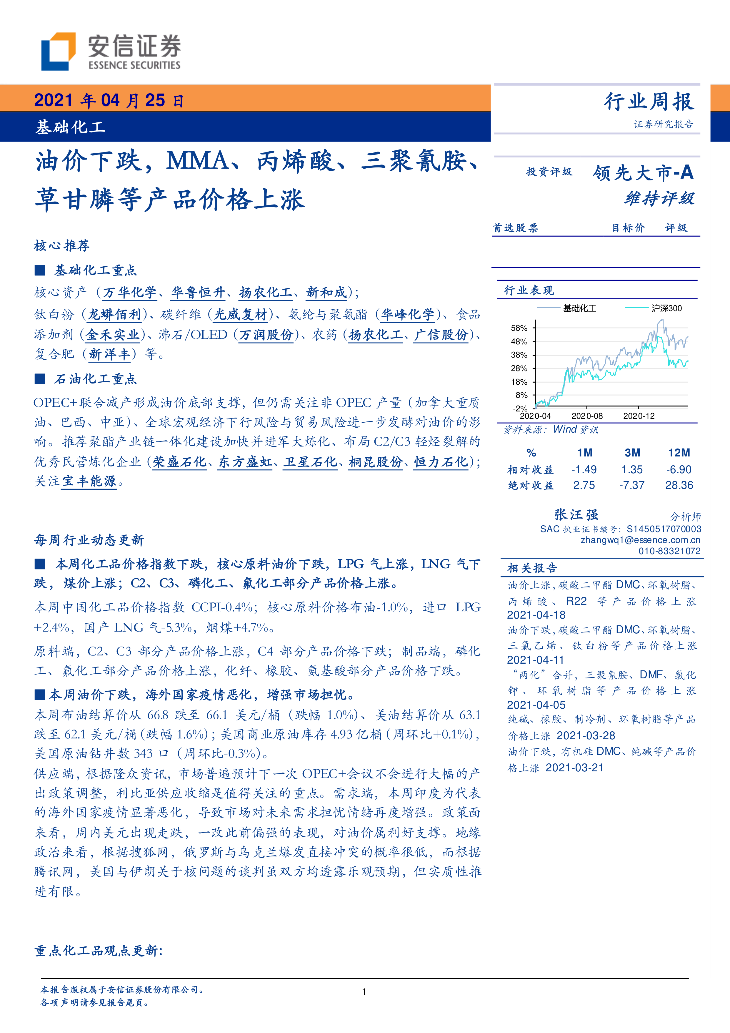 本报告的核心观点是:受油价下跌和部分化工产品需求提升的共同影响,基础化工行业呈现出分化态势。部分产品如MMA、丙烯酸、三聚氰胺、草甘膦等价格上涨,而其他产品价格则出现下跌。 市场整体表现与沪深300指数相比略显逊色,但部分细分领域仍存在投资机会。