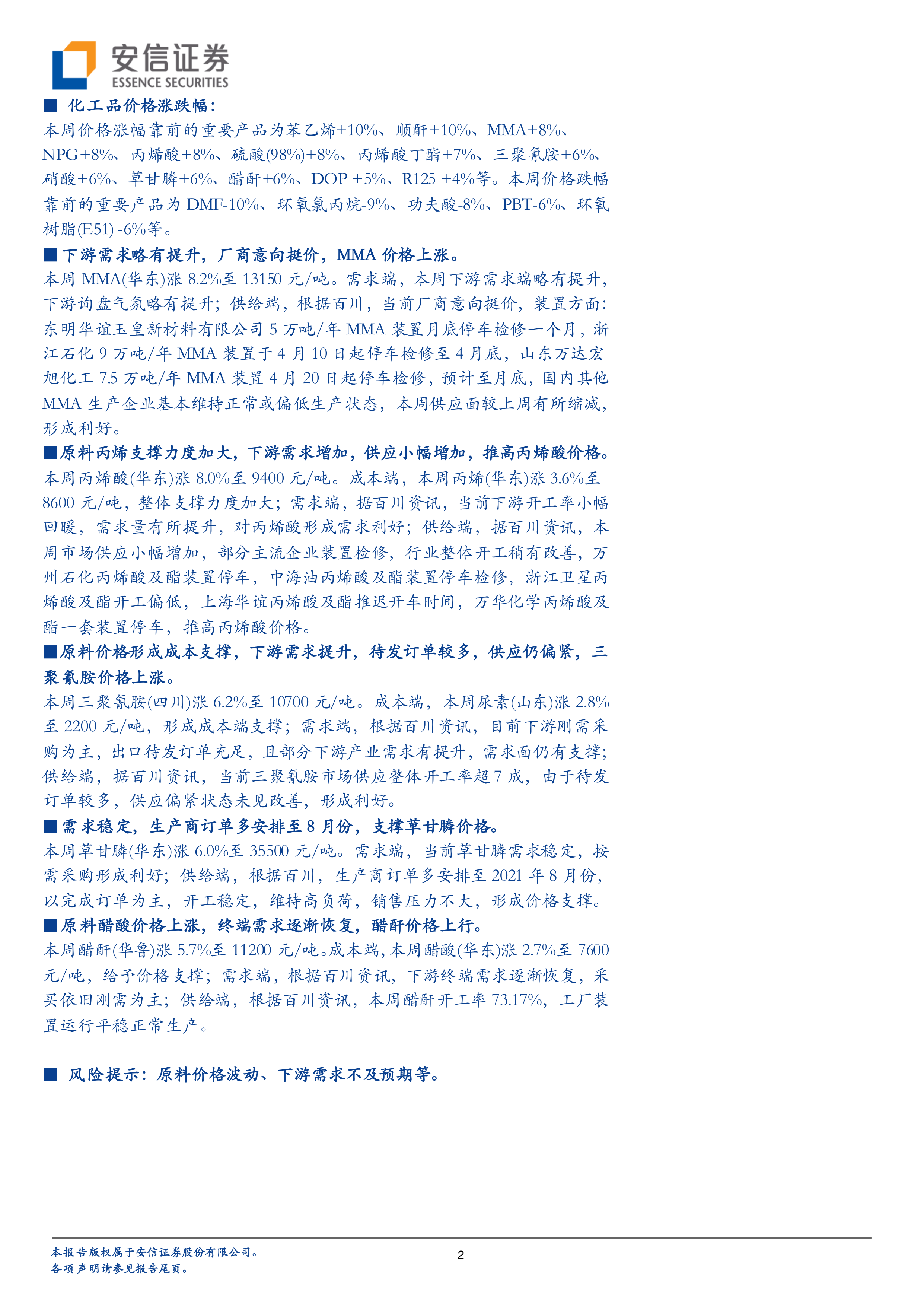 本周 MMA 价格上涨 8.2% 至 13150 元/吨,主要原因是下游需求略有提升,厂商意向挺价,以及部分 MMA 装置停车检修导致供应减少。