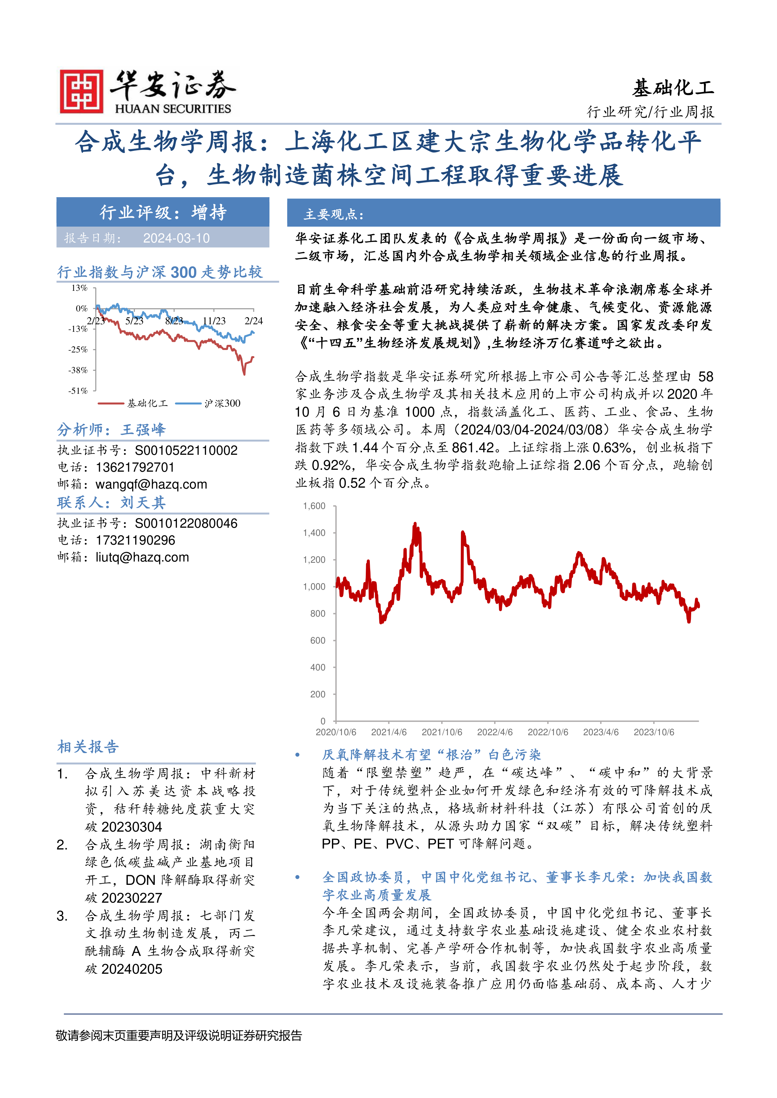 本报告为华安证券研究所发布的合成生物学周报(2024年3月10日),核心观点如下: