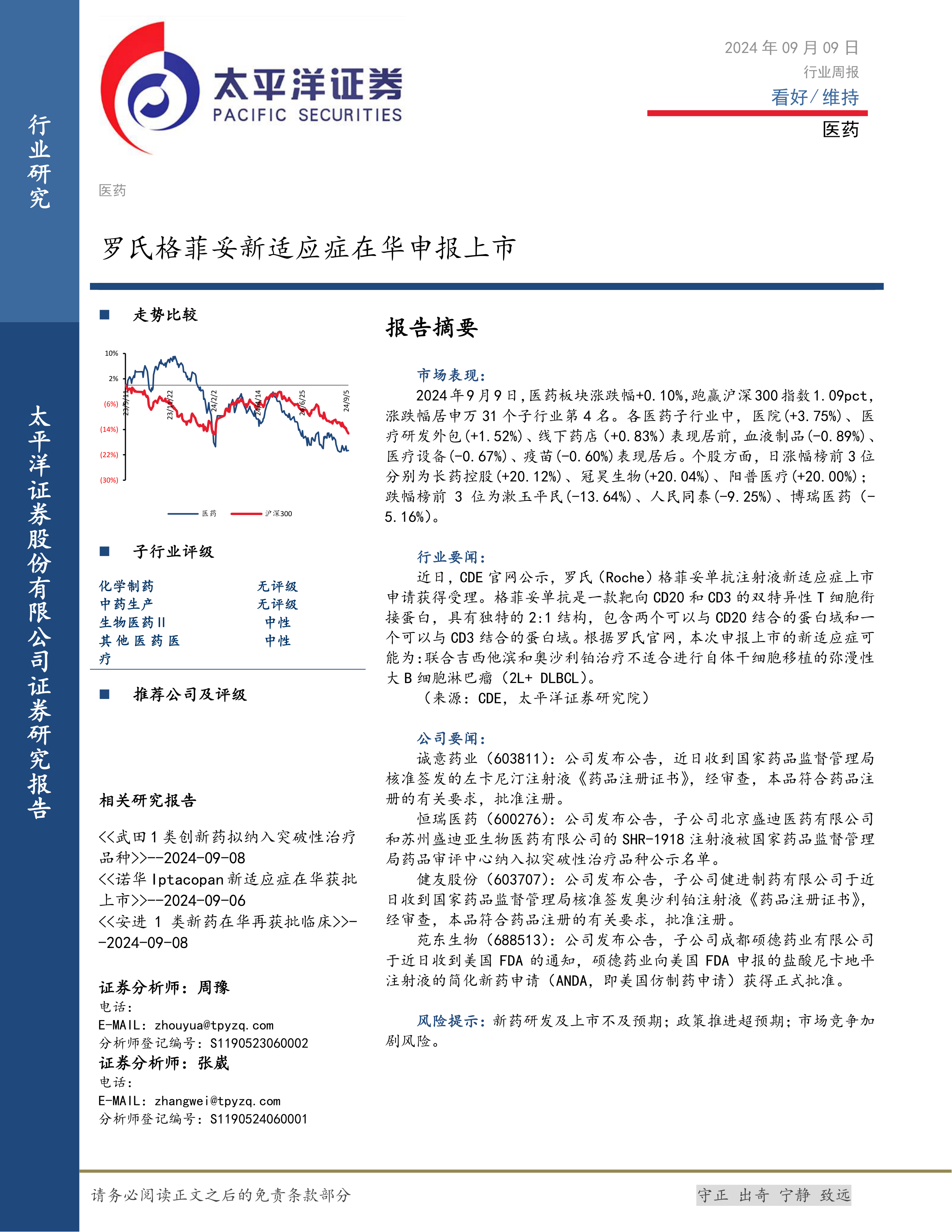 本报告对2024年9月9日医药行业周报进行了数据分析和解读。报告指出,医药行业整体表现稳健,但个股涨跌分化明显,部分子行业和个股表现突出,部分则相对滞后。罗氏格菲妥单抗新适应症在华申报上市以及多家公司在药品注册和新药研发方面的进展,为行业发展注入了活力。然而,新药研发及上市的不确定性、政策变化以及市场竞争加剧等风险依然存在,投资者需谨慎评估投资风险。报告未提供具体的投资建议,仅对行业和公司动态进行了客观分析。