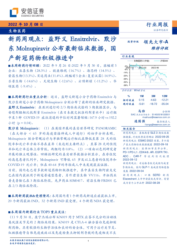 本报告通过对2022年9月26日至9月30日生物医药行业新药市场表现的统计分析,以及对国内外重点新药研发进展的梳理,展现了生物医药行业动态。 市场波动较大,个股表现差异显著;新冠药物市场竞争激烈,疗效、安全性及市场准入将成为关键竞争因素;国内外新药研发持续推进,创新药物不断涌现。 投资者需密切关注临床试验进展、监管政策变化以及市场竞争格局,谨慎进行投资决策。 本报告仅供参考,不构成投资建议。