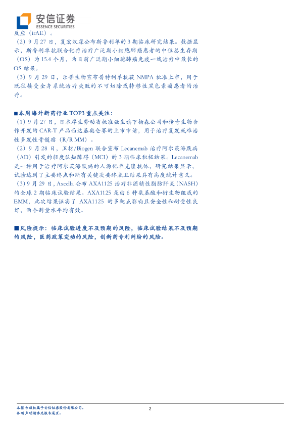 (1) 9 月 27 日,日本厚生劳动省批准强生旗下杨森公司和传奇生物合作开发的 CAR-T 产品西达基奥仑赛的上市申请,用于治疗复发或难治性多发性骨髓瘤(R/R MM) 。