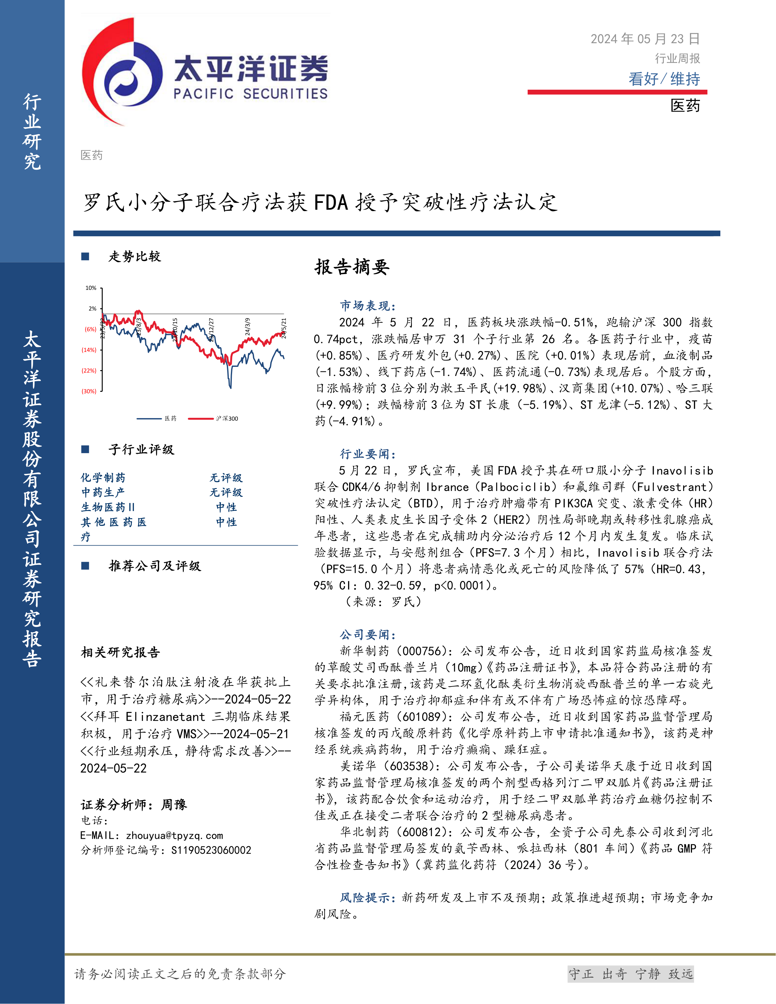 本报告的核心观点是:医药行业整体表现分化,部分细分领域表现强劲,但整体受市场波动影响。罗氏小分子联合疗法获批突破性疗法认定是行业利好消息,但需关注新药研发及上市的不确定性,以及市场竞争加剧的风险。