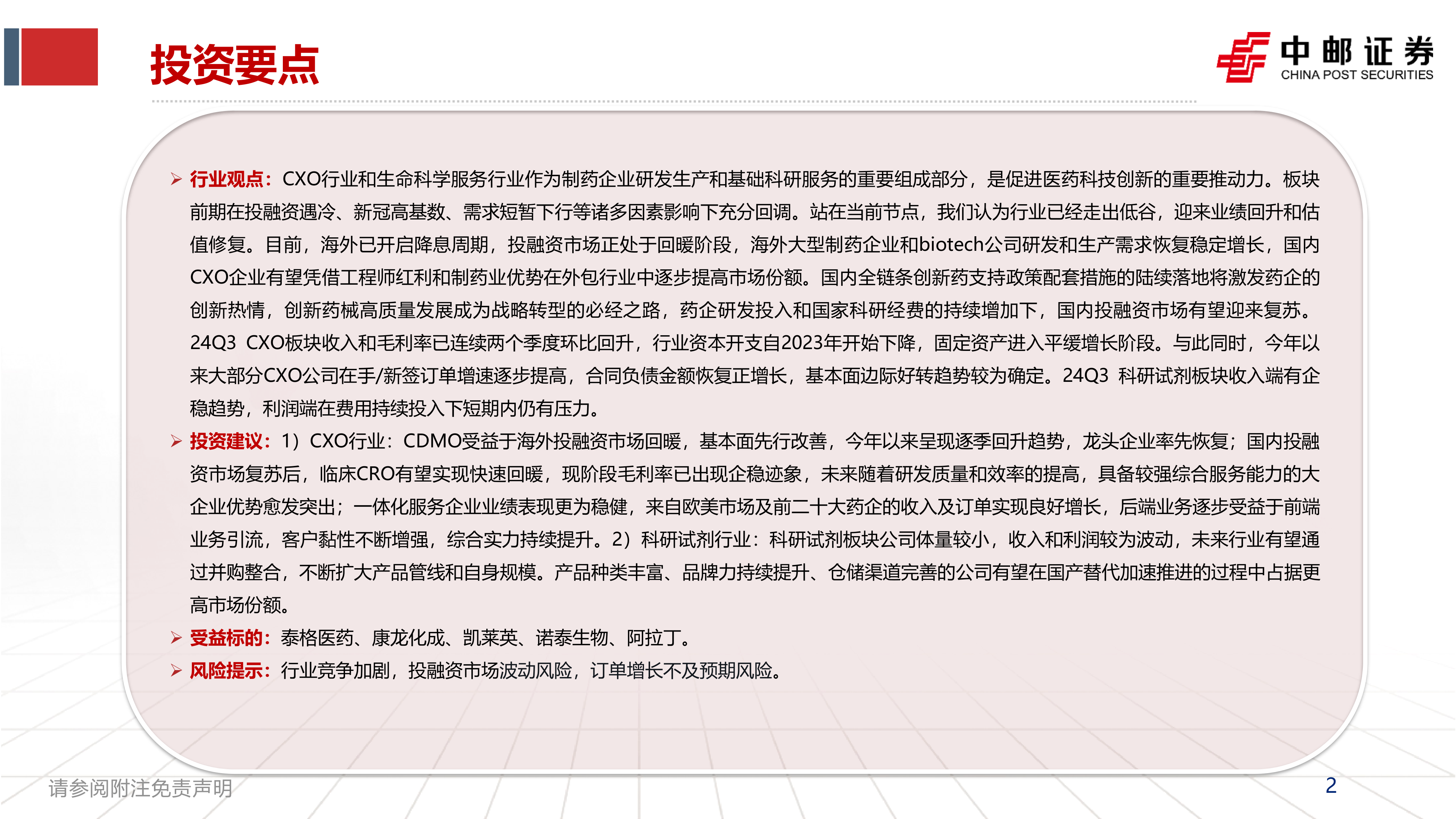 投资建议:1)CXO行业:CDMO受益于海外投融资市场回暖,基本面先行改善,今年以来呈现逐季回升趋势,龙头企业率先恢复;国内投融资市场复苏后,临床CRO有望实现快速回暖,现阶段毛利率已出现企稳迹象,未来随着研发质量和效率的提高,具备较强综合服务能力的大企业优势愈发突出;一体化服务企业业绩表现更为稳健,来自欧美市场及前二十大药企的收入及订单实现良好增长,后端业务逐步受益于前端业务引流,客户黏性不断增强,综合实力持续提升。2)科研试剂行业:科研试剂板块公司体量较小,收入和利润较为波动,未来行业有望通过并购整合,不断扩大产品管线和自身规模。产品种类丰富、品牌力持续提升、仓储渠道完善的公司有望在国产替代加速推进的过程中占据更高市场份额。