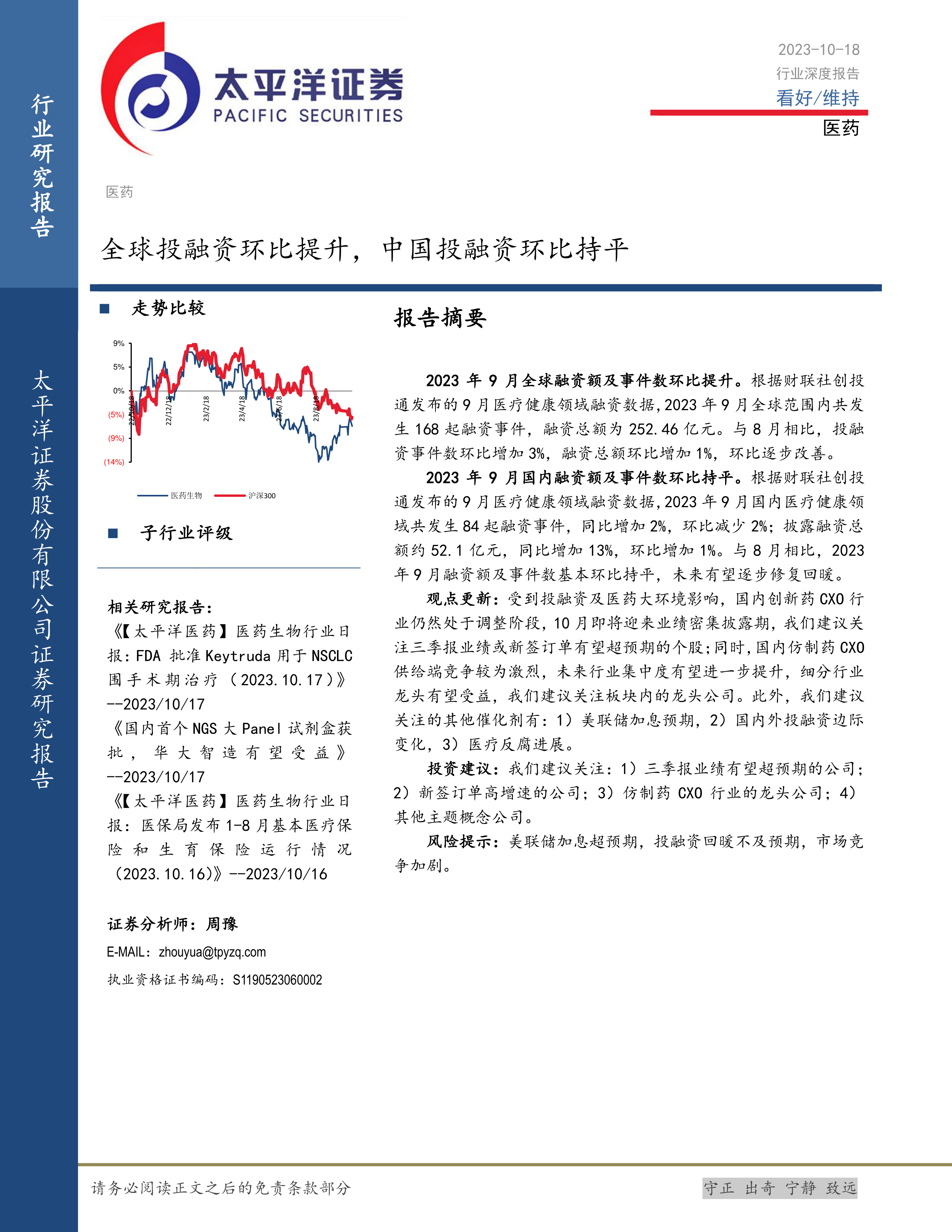 本报告的核心观点是:2023年9月,全球医药领域投融资环比增长,而中国医药领域投融资则基本持平。 国内创新药CXO行业仍处于调整期,但未来有望逐步回暖。报告建议关注三季报业绩或新签订单有望超预期的公司,以及仿制药CXO行业的龙头公司。