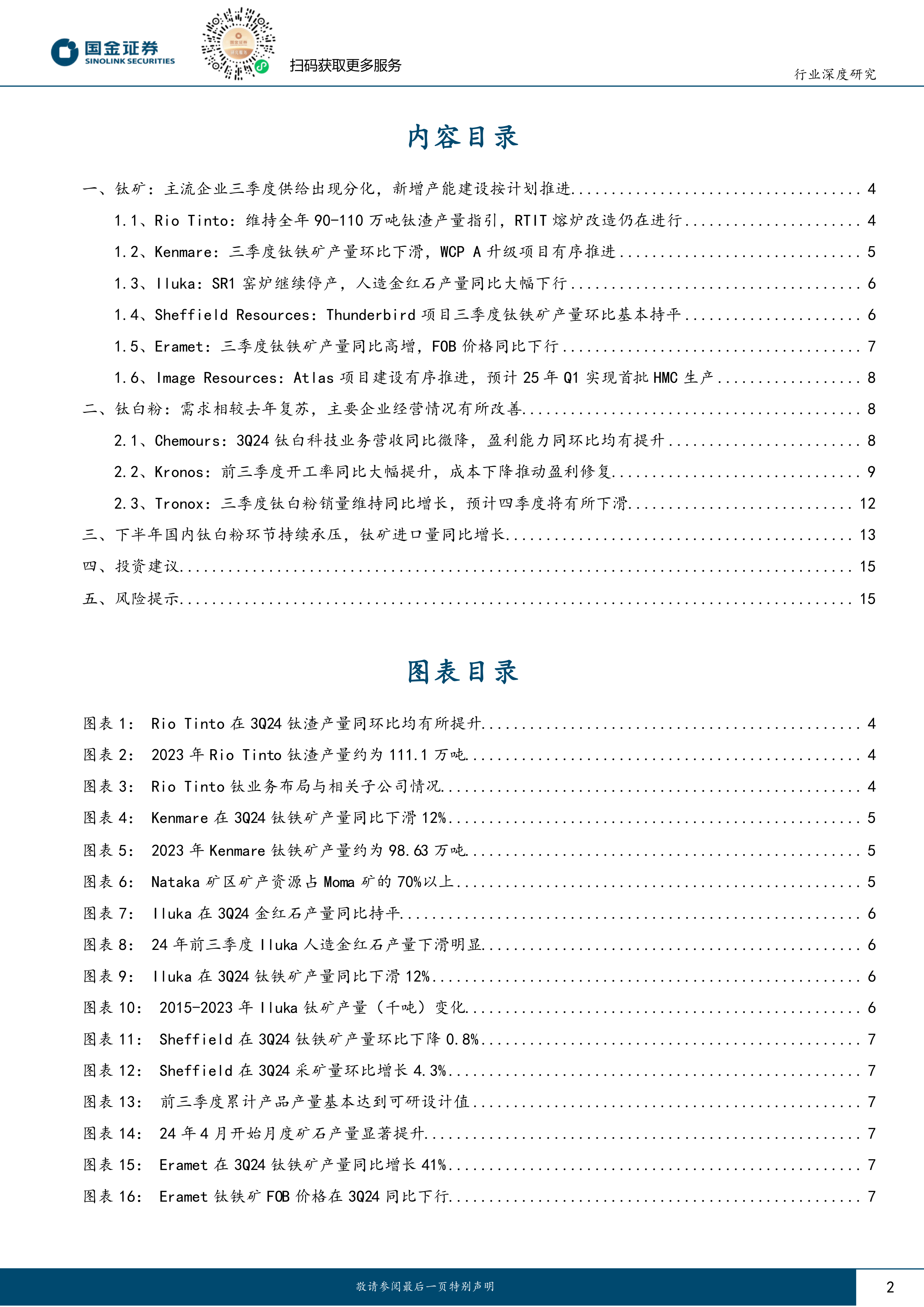本报告对2024年前三季度全球钛矿和钛白粉市场进行了深入分析,指出钛矿市场供给分化,新增产能稳步推进;钛白粉市场需求复苏,企业经营状况改善,但国内市场价格承压。报告最后提出了投资建议和风险提示,为投资者提供参考。 报告数据主要来源于各公司公告和公开市场数据,力求客观准确,但不能保证其绝对完整性和准确性,仅供参考。