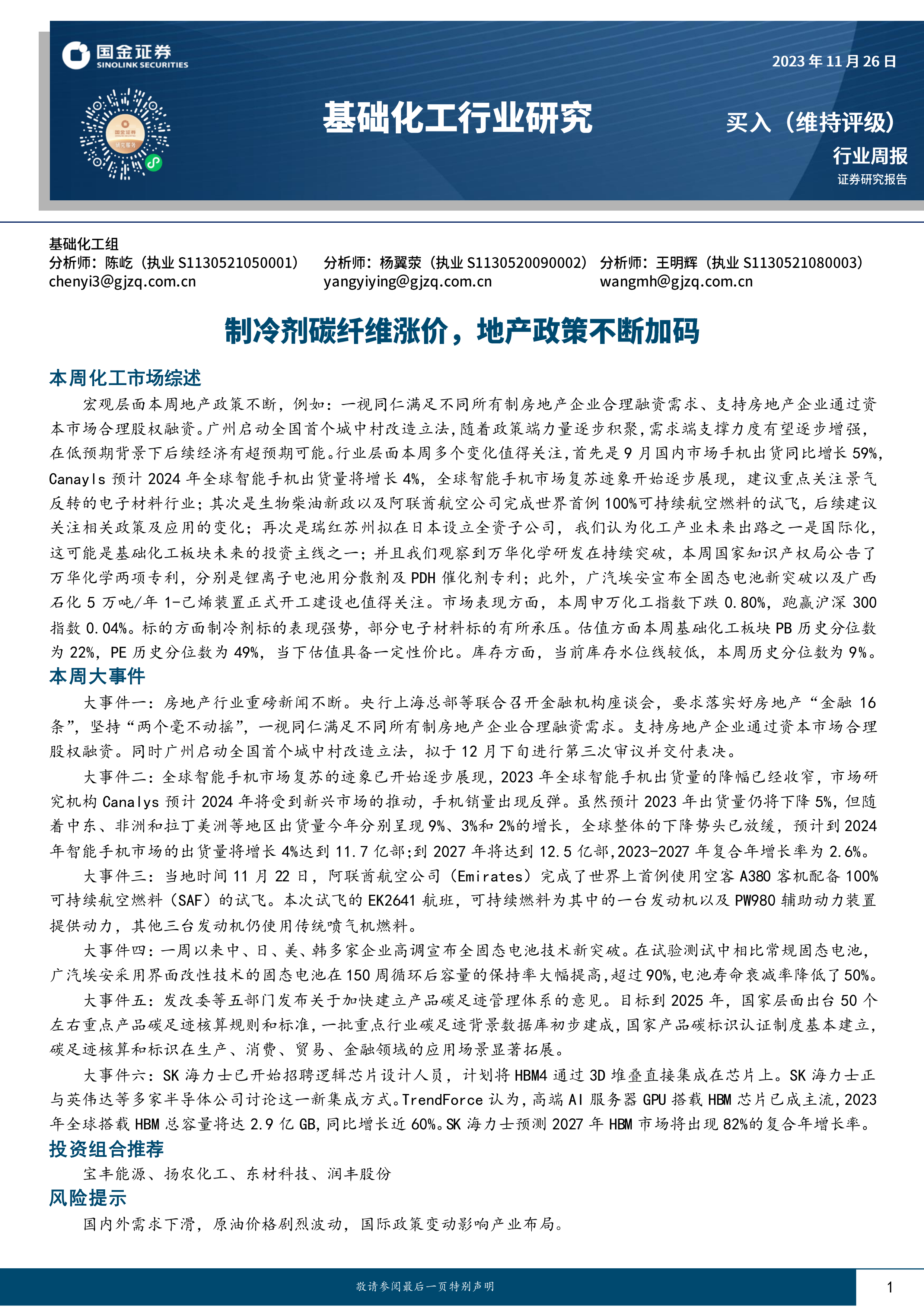 基础化工行业研究:制冷剂碳纤维涨价,地产政策不断加码