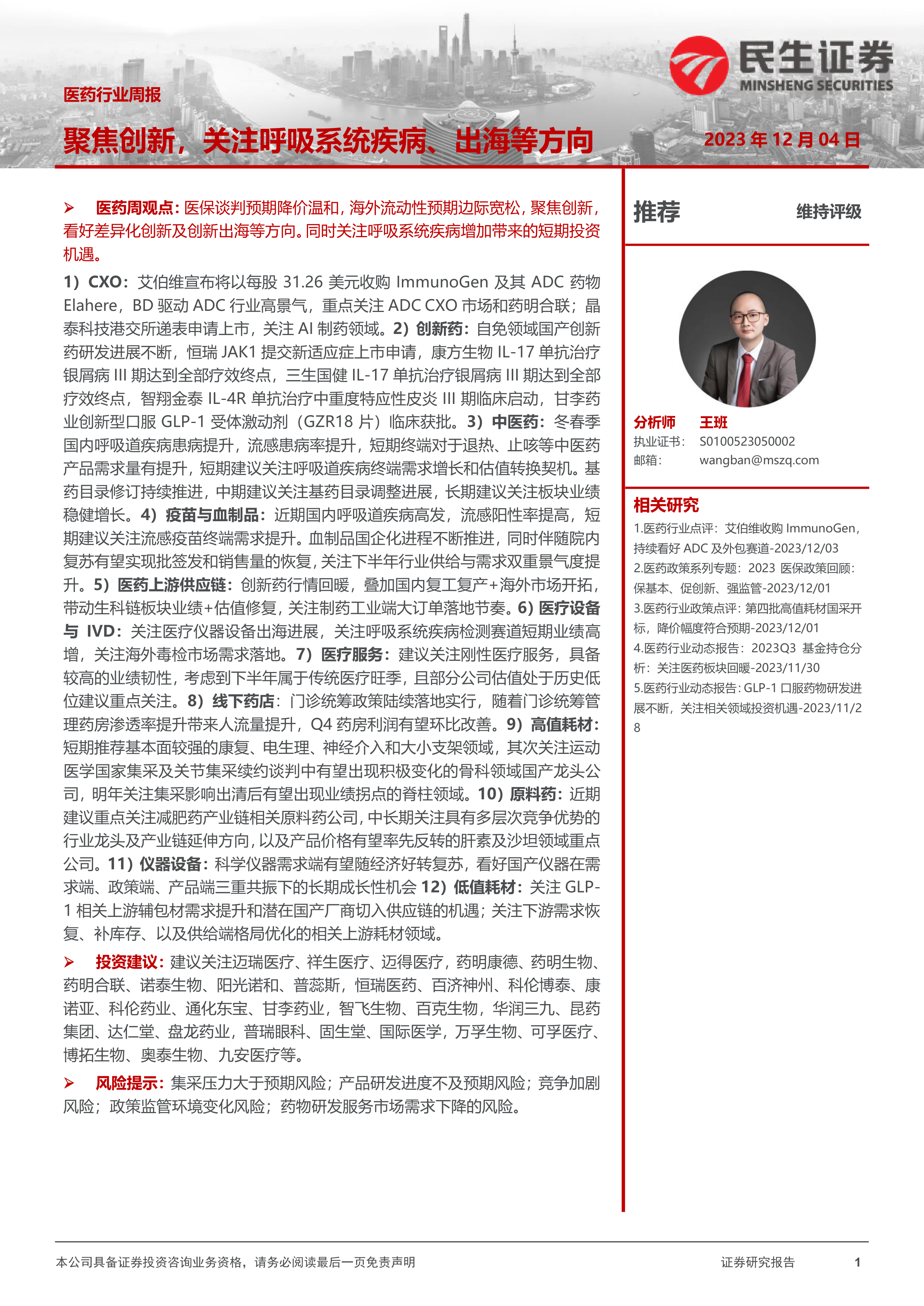 1)CXO:艾伯维宣布将以每股31.26美元收购ImmunoGen及其ADC药物Elahere,BD驱动ADC行业高景气,重点关注ADCCXO市场和药明合联;晶泰科技港交所递表申请上市,关注AI制药领域。2)创新药:自免领域国产创新药研发进展不断,恒瑞JAK1提交新适应症上市申请,康方生物IL-17单抗治疗银屑病III期达到全部疗效终点,三生国健IL-17单抗治疗银屑病III期达到全部疗效终点,智翔金泰IL-4R单抗治疗中重度特应性皮炎III期临床启动,甘李药业创新型口服GLP-1受体激动剂(GZR18片)临床获批。3)中医药:冬春季国内呼吸道疾病患病提升,流感患病率提升,短期终端对于退热、止咳等中医药产品需求量有提升,短期建议关注呼吸道疾病终端需求增长和估值转换契机。基药目录修订持续推进,中期建议关注基药目录调整进展,长期建议关注板块业绩稳健增长。4)疫苗与血制品:近期国内呼吸道疾病高发,流感阳性率提高,短期建议关注流感疫苗终端需求提升。血制品国企化进程不断推进,同时伴随院内复苏有望实现批签发和销售量的恢复,关注下半年行业供给与需求双重景气度提升。5)医药上游供应链:创新药行情回暖,叠加国内复工复产+海外市场开拓,带动生科链板块业绩+估值修复,关注制药工业端大订单落地节奏。6)医疗设备与IVD:关注医疗仪器设备出海进展,关注呼吸系统疾病检测赛道短期业绩高增,关注海外毒检市场需求落地。7)医疗服务:建议关注刚性医疗服务,具备较高的业绩韧性,考虑到下半年属于传统医疗旺季,且部分公司估值处于历史低位建议重点关注。8)线下药店:门诊统筹政策陆续落地实行,随着门诊统筹管理药房渗透率提升带来人流量提升,Q4药房利润有望环比改善。9)高值耗材:短期推荐基本面较强的康复、电生理、神经介入和大小支架领域,其次关注运动医学国家集采及关节集采续约谈判中有望出现积极变化的骨科领域国产龙头公司,明年关注集采影响出清后有望出现业绩拐点的脊柱领域。10)原料药:近期建议重点关注减肥药产业链相关原料药公司,中长期关注具有多层次竞争优势的行业龙头及产业链延伸方向,以及产品价格有望率先反转的肝素及沙坦领域重点公司。11)仪器设备:科学仪器需求端有望随经济好转复苏,看好国产仪器在需求端、政策端、产品端三重共振下的长期成长性机会12)低值耗材:关注GLP-1相关上游辅包材需求提升和潜在国产厂商切入供应链的机遇;关注下游需求恢复、补库存、以及供给端格局优化的相关上游耗材领域。