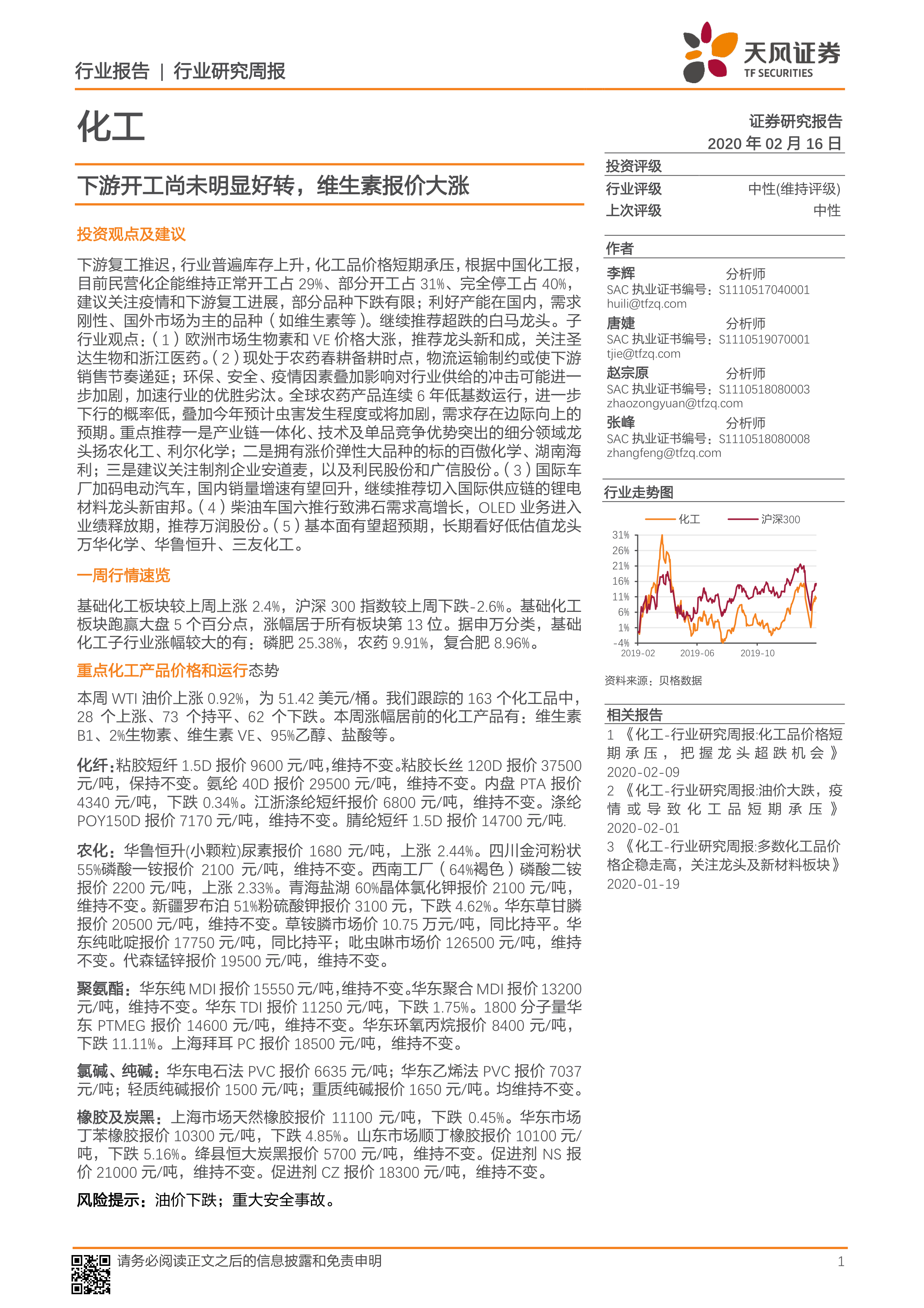 本报告通过对化工行业板块行情、重点化工产品价格走势以及行业新闻的分析,得出下游复工延迟导致化工品价格短期承压的结论。然而,部分产品,特别是维生素类产品,由于其独特的市场结构和竞争优势,表现出较强的抗跌性甚至逆势上涨。报告建议投资者关注疫情和下游复工进展,并重点关注具有核心竞争力、在细分领域具有优势的龙头企业。 报告中大量的数据和图表为投资者提供了全面的市场信息,有助于投资者做出更明智的投资决策。 需要注意的是,报告中提到的投资建议仅供参考,投资者应根据自身情况进行独立判断。