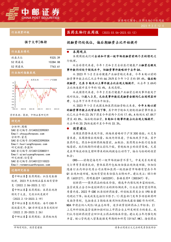 中邮观点: 包含本周观点、投资建议、本周行业表现、公司动态和行业动态五个部分。本周观点主要分析了全球和中国医药生物行业一级市场投融资情况,并对不同轮次融资占比的变化进行了深入解读。投资建议部分则根据市场表现和行业发展趋势,对CRO、创新药、医疗消费、医疗新基建后周期和原料药等细分领域提出了具体的投资策略和标的推荐。本周行业表现部分总结了医药板块及二级子行业的涨跌幅情况,并对个股涨跌幅进行了排名。公司动态部分详细介绍了多家医药公司在本周的重大事件,例如新产品获批、员工持股计划、年报发布等。行业动态部分则梳理了本周医药行业相关的政策法规、市场动态等重要信息。