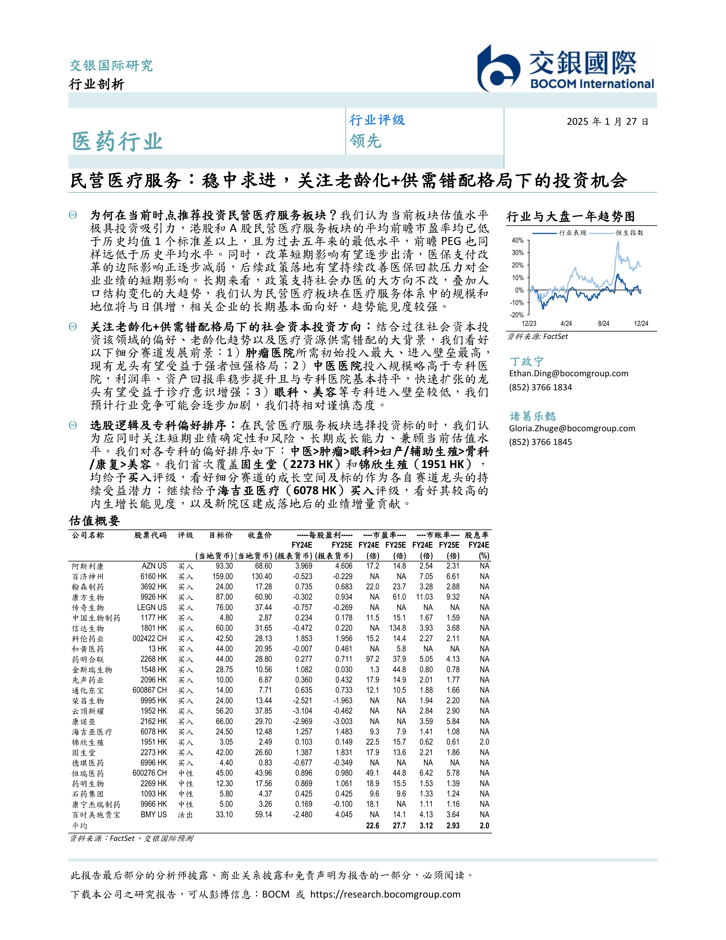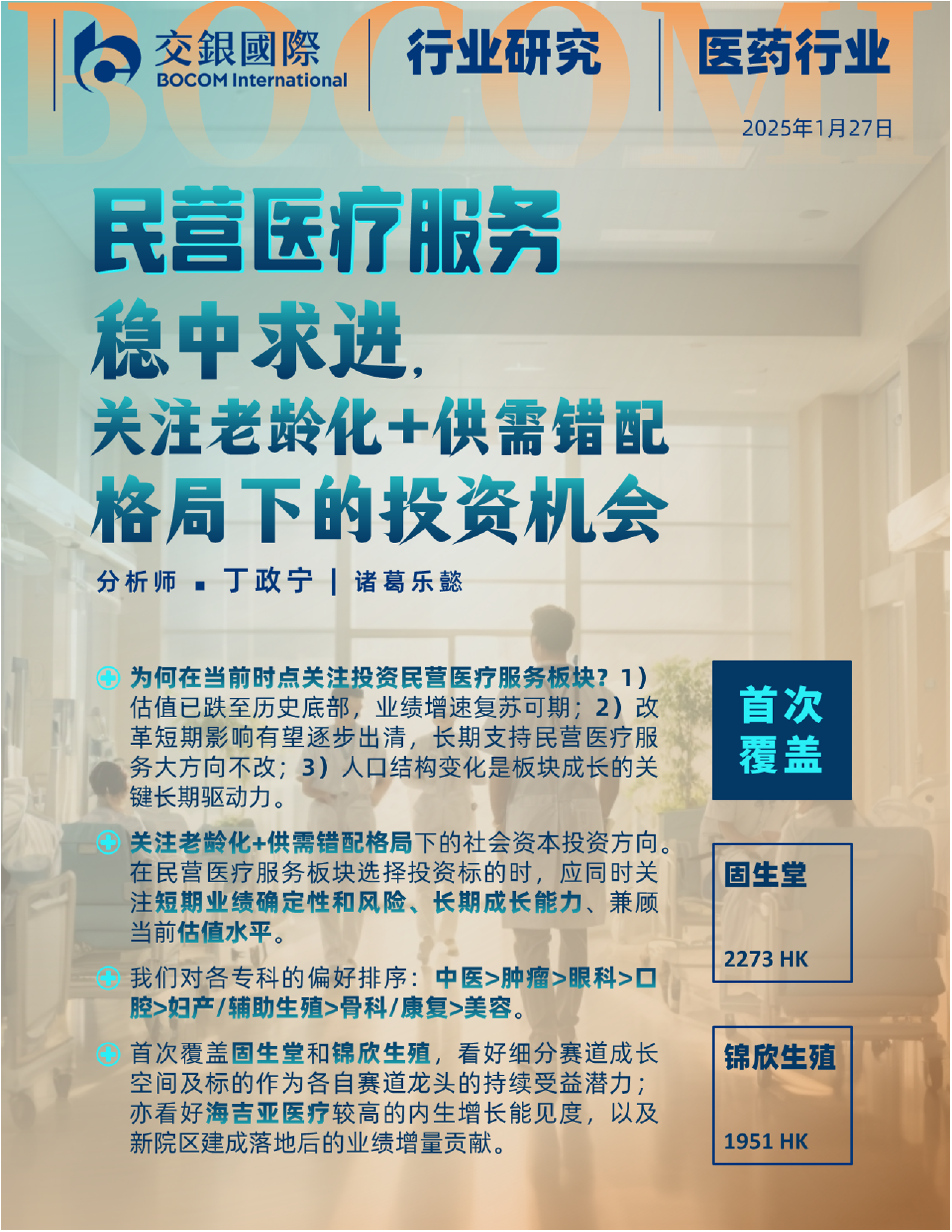 本报告基于对中国民营医疗服务市场现状、发展趋势以及相关政策的深入分析,认为当前民营医疗服务板块估值处于历史低位,投资机会显著。报告重点推荐关注中医、肿瘤等年龄相关疾病专科,并对固生堂、锦欣生殖和海吉亚医疗三家公司给予买入评级,看好其在细分赛道的长期发展潜力。 报告同时强调了医保支付改革的影响,以及人口老龄化和医疗资源供需错配对行业发展带来的长期利好。 投资者需仔细阅读报告最后部分的分析师披露、商业关系披露和免责声明。