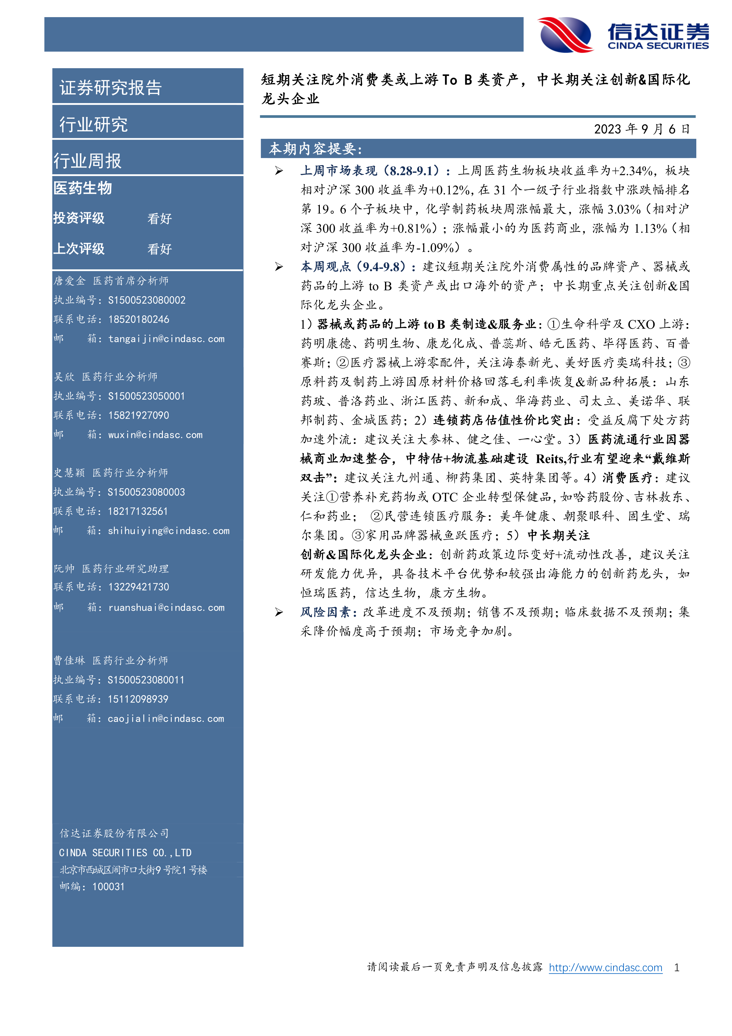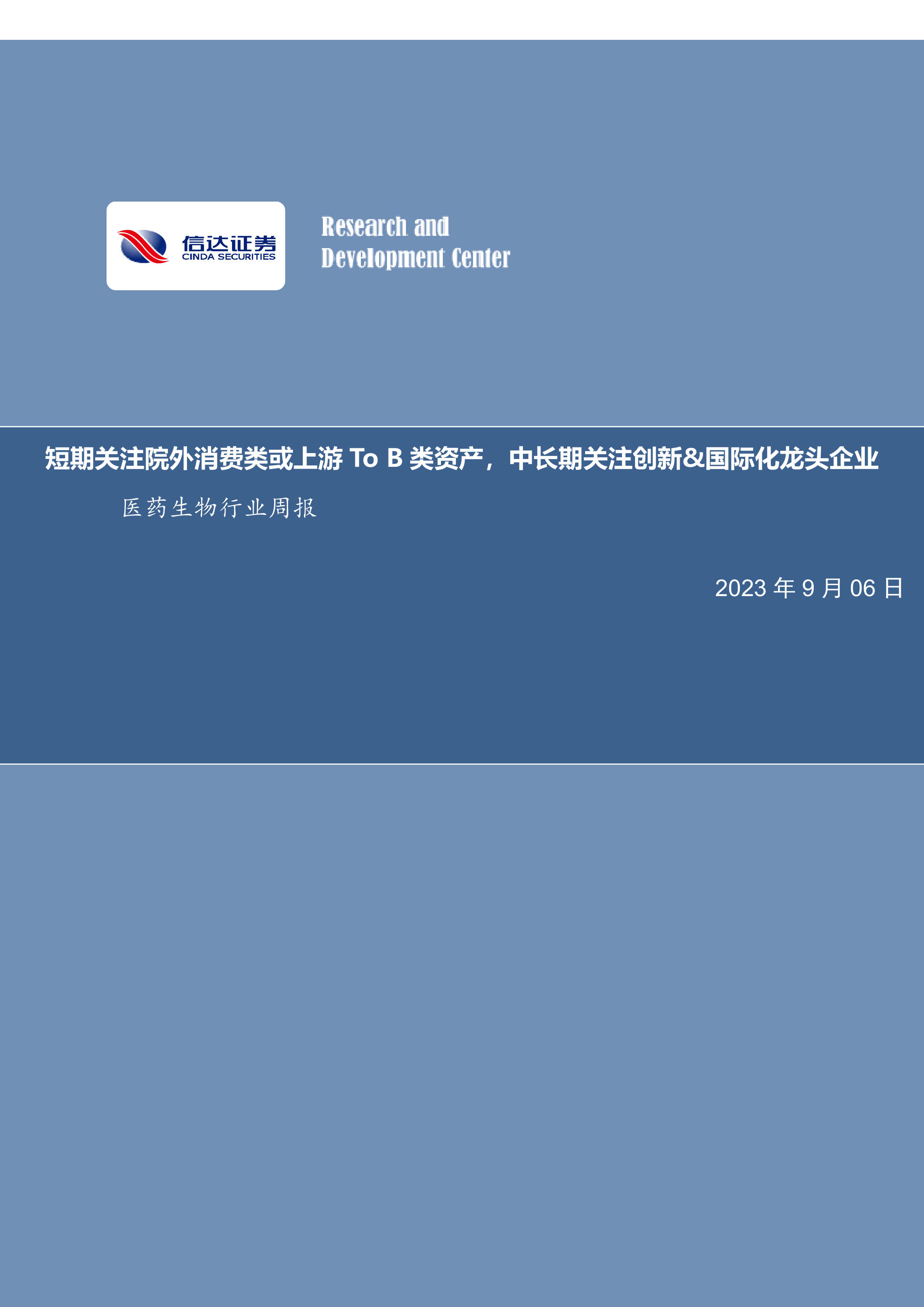 医药生物行业周报:短期关注院外消费类或上游To B类资产,中长期关注创新&国际化龙头企业