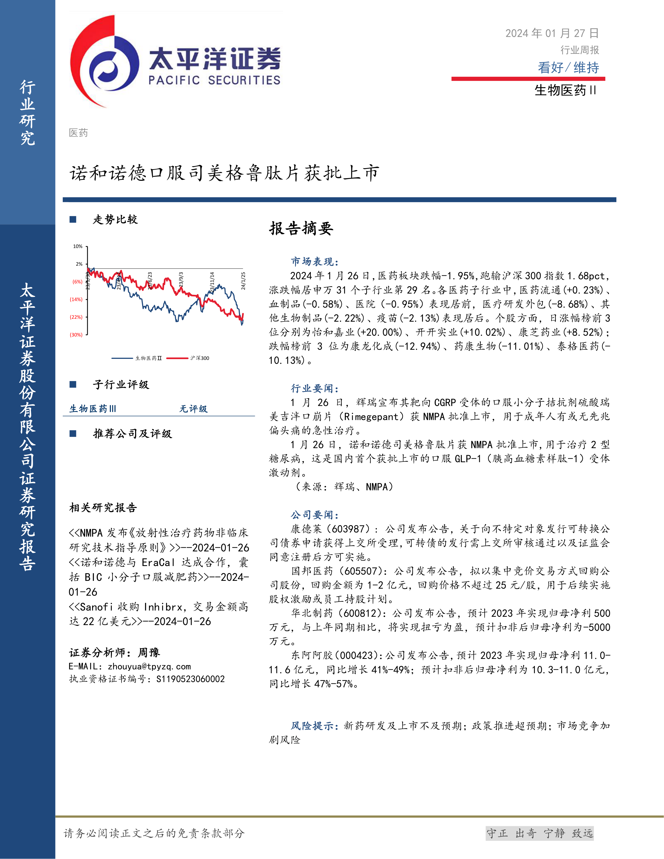 生物医药Ⅱ行业周报:诺和诺德口服司美格鲁肽片获批上市