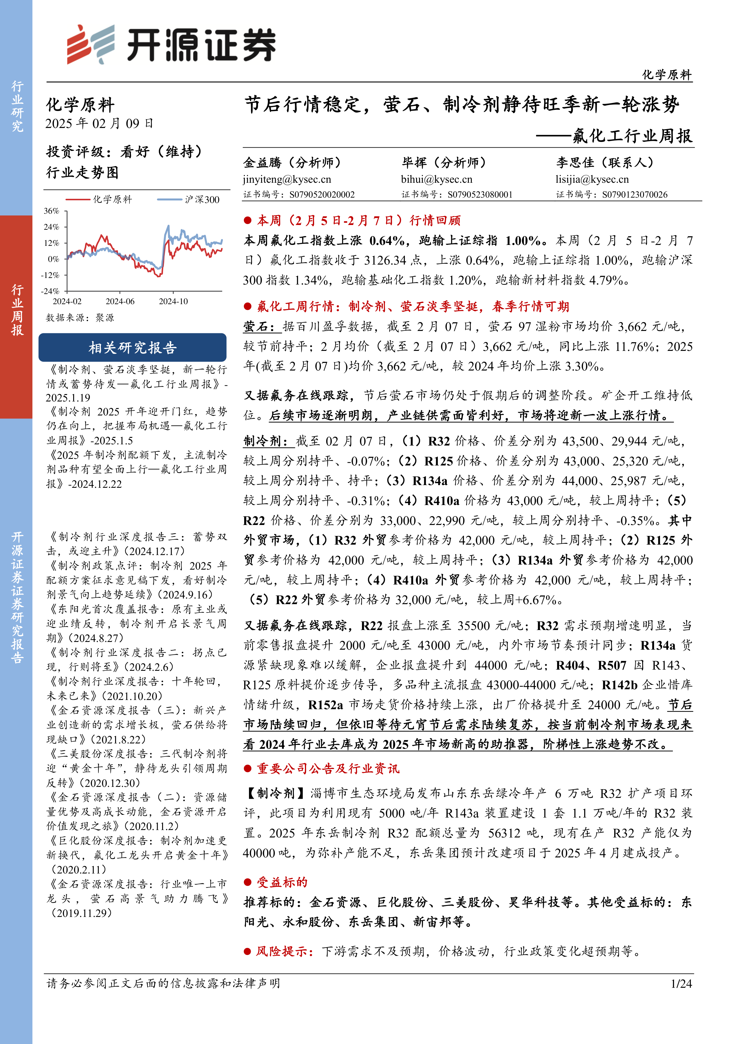 本周氟化工指数上涨0.64%,但跑输上证综指、沪深300指数、基础化工指数和新材料指数。萤石价格维持稳定,同比上涨11.76%,2025年均价预计较2024年上涨3.30%。制冷剂价格稳中有升,R22外贸价格涨幅显著,其他品种价格基本持平。整体来看,氟化工产业链已进入长景气周期,具有较大发展潜力。