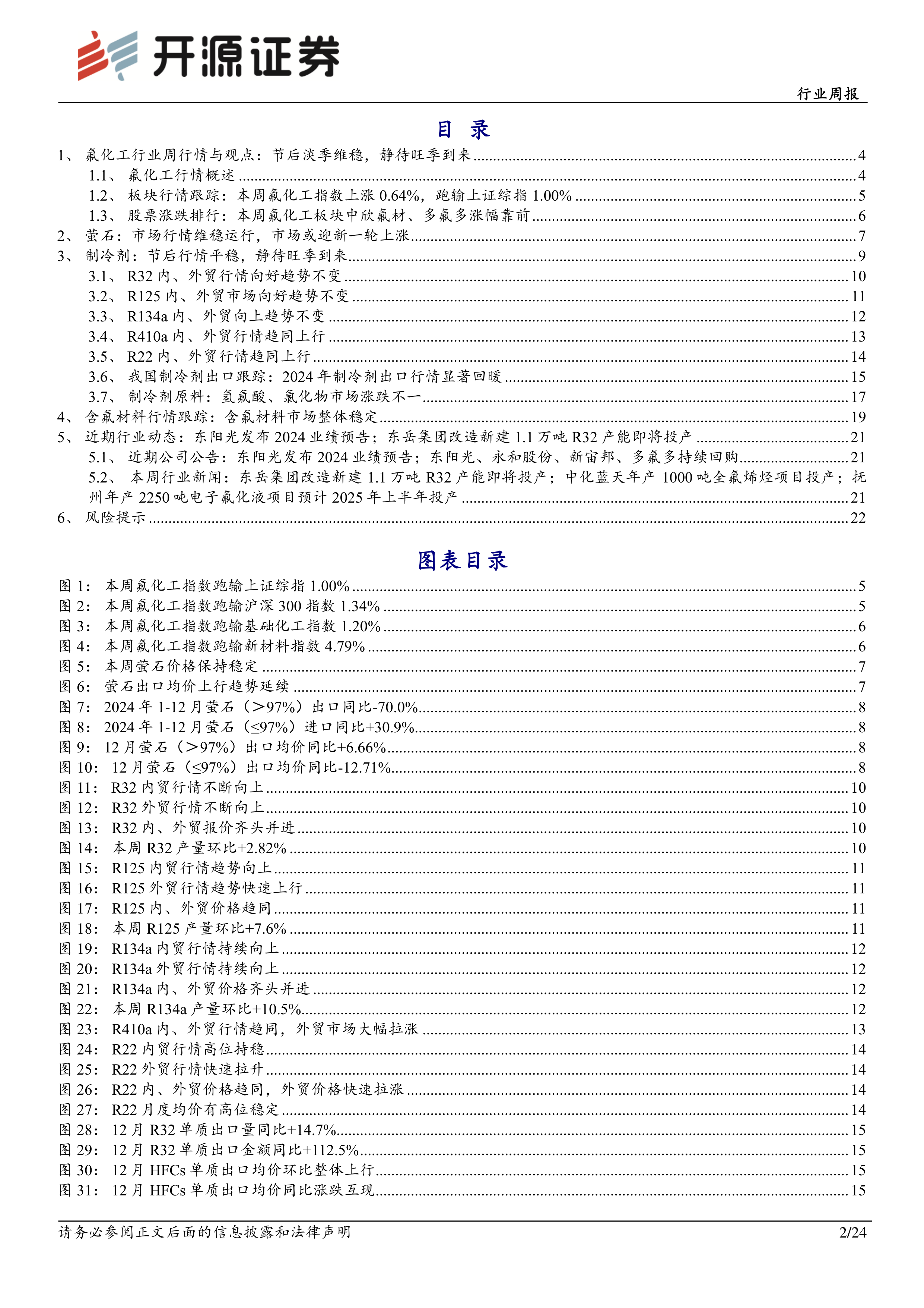 东岳集团改造新建1.1万吨R32产能即将投产;中化蓝天年产1000吨全氟烯烃项目投产;抚州年产2250吨电子氟化液项目预计2025年上半年投产。