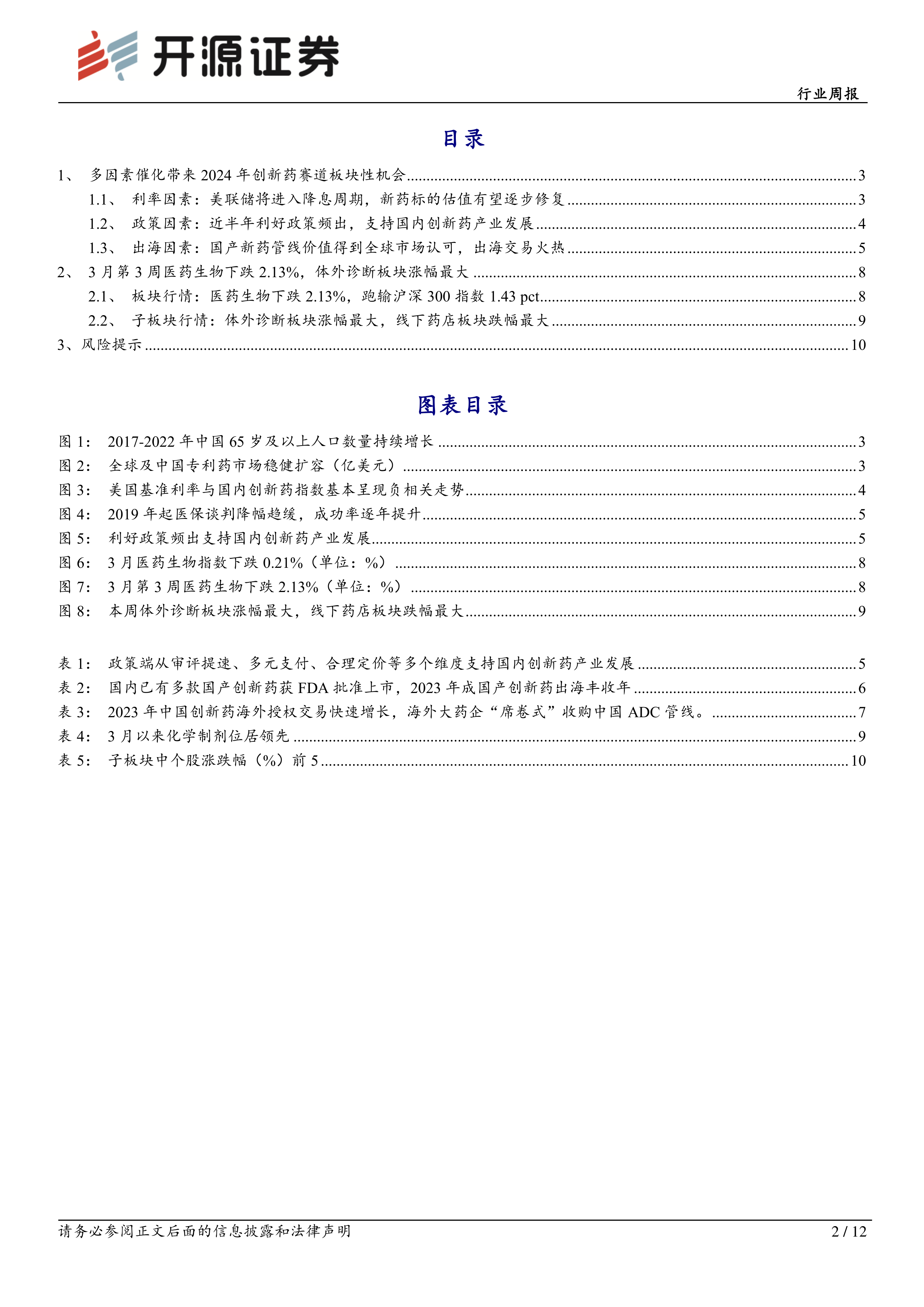 本报告基于市场数据和公开信息,分析了2024年创新药赛道可能出现的板块性机会,并对3月第3周医药生物行业的走势进行了总结。报告认为,美联储降息预期、利好政策频出以及国产创新药出海交易火热等多重因素将共同推动创新药赛道发展。然而,报告也提示了政策推进不及预期、市场竞争加剧以及产品销售不及预期等风险因素。投资者应谨慎评估风险,结合自身情况做出投资决策。