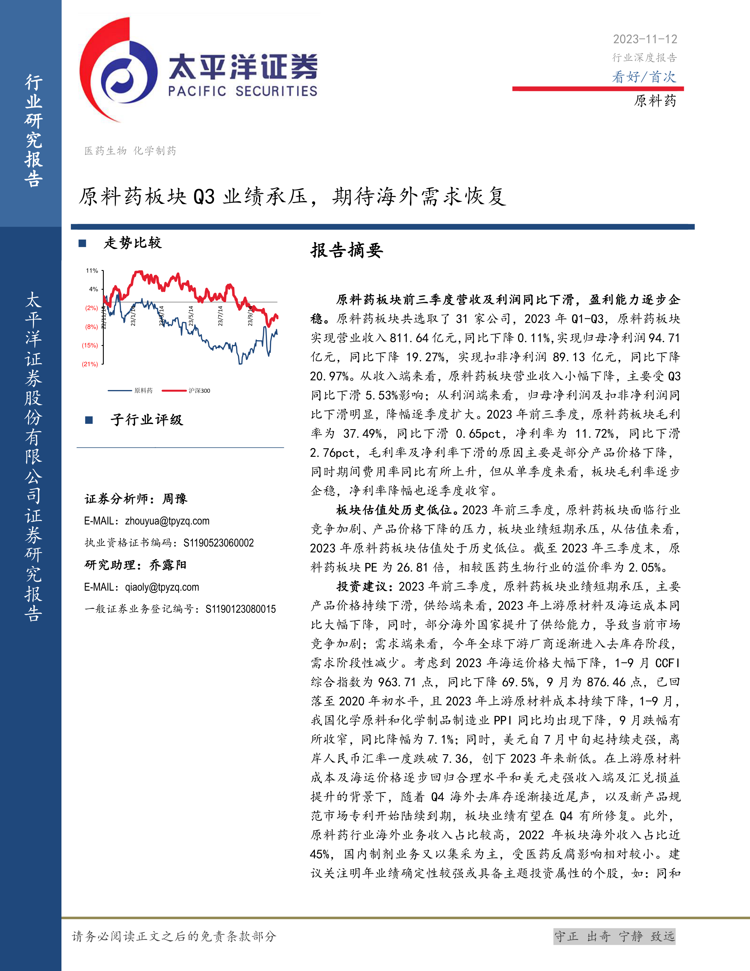 原料药行业深度报告:原料药板块Q3业绩承压,期待海外需求恢复