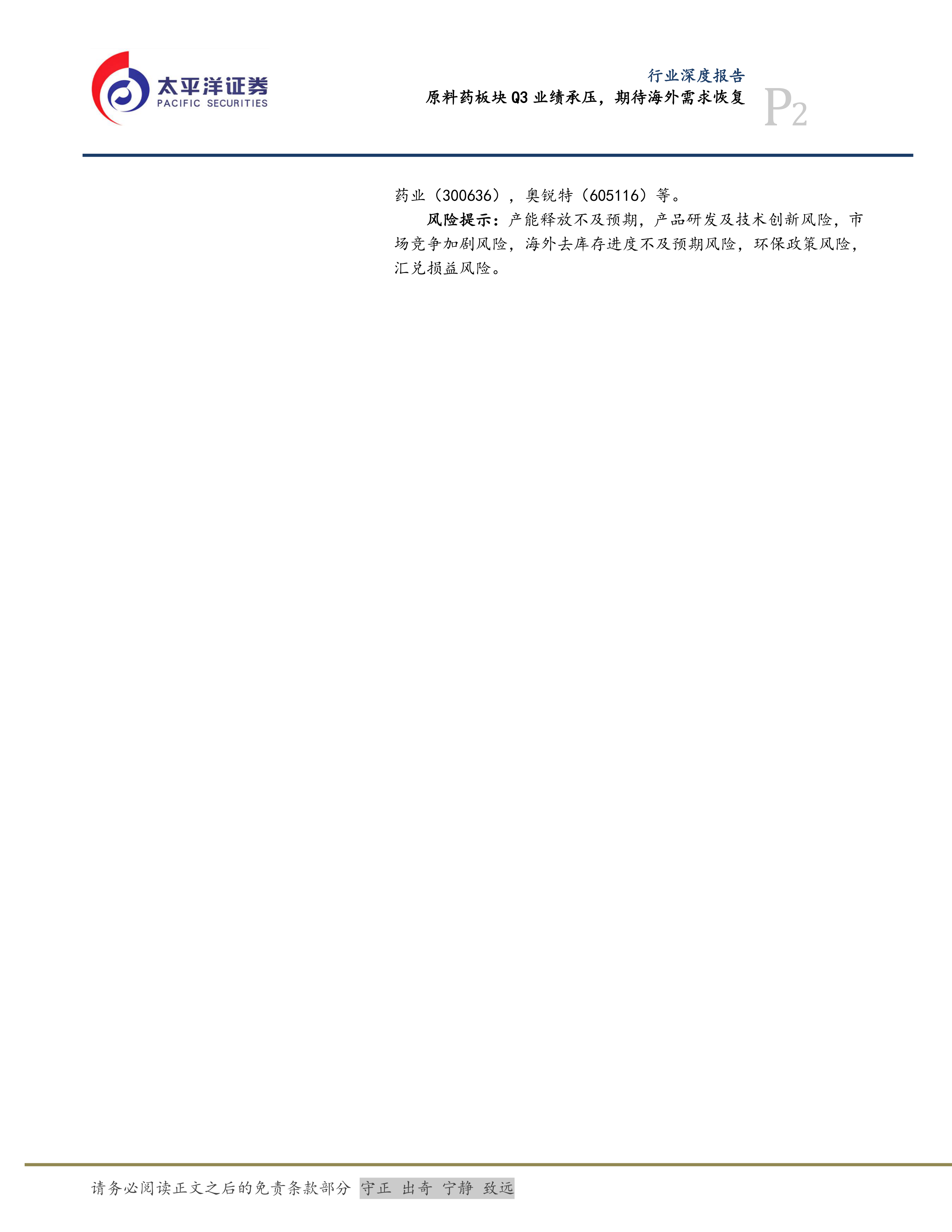 投资建议: 2023 年前三季度,原料药板块业绩短期承压,主要产品价格持续下滑,供给端来看, 2023 年上游原材料及海运成本同比大幅下降,同时,部分海外国家提升了供给能力,导致当前市场竞争加剧;需求端来看,今年全球下游厂商逐渐进入去库存阶段,需求阶段性减少。考虑到 2023 年海运价格大幅下降, 1-9 月 CCFI综合指数为 963.71 点,同比下降 69.5%, 9 月为 876.46 点,已回落至 2020 年初水平,且 2023 年上游原材料成本持续下降, 1-9 月,我国化学原料和化学制品制造业 PPI 同比均出现下降, 9 月跌幅有所收窄,同比降幅为 7.1%;同时,美元自 7 月中旬起持续走强,离岸人民币汇率一度跌破 7.36,创下 2023 年来新低。在上游原材料成本及海运价格逐步回归合理水平和美元走强收入端及汇兑损益提升的背景下,随着 Q4 海外去库存逐渐接近尾声,以及新产品规范市场专利开始陆续到期,板块业绩有望在 Q4 有所修复。此外,原料药行业海外业务收入占比较高, 2022 年板块海外收入占比近45%,国内制剂业务又以集采为主,受医药反腐影响相对较小。建议关注明年业绩确定性较强或具备主题投资属性的个股,如:同和药业(300636),奥锐特(605116)等。