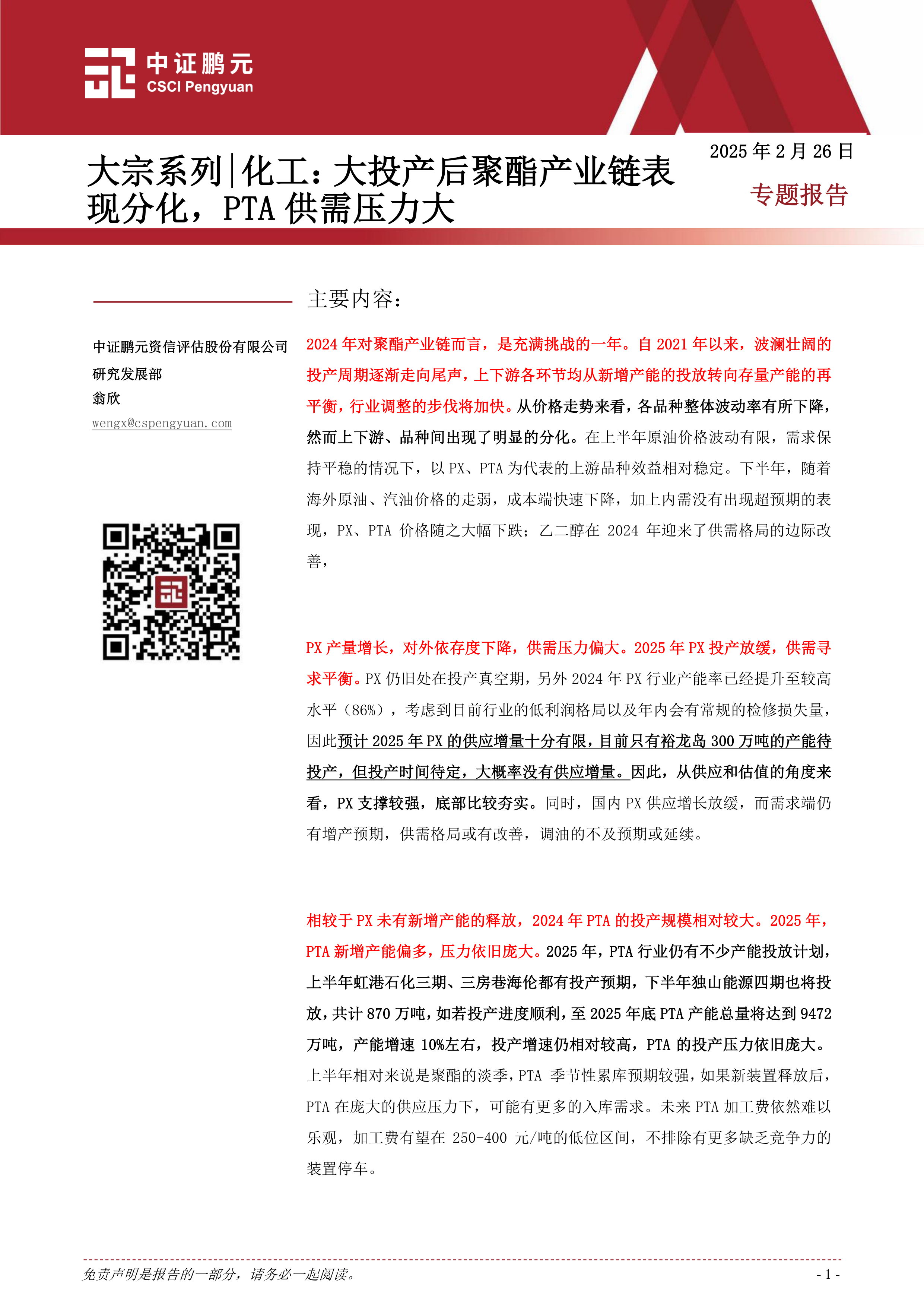 本报告对2025年聚酯产业链的市场走势进行了深入分析,指出2025年将是聚酯产业链供需格局分化的一年。PTA产能过剩压力巨大,价格和加工费将持续承压;PX和乙二醇供需相对平衡,价格有望维持稳定;聚酯产品内部也存在显著分化,瓶片压力最大,长丝和短纤相对稳定。 报告建议投资者密切关注产业链各环节的供需变化,以及政策和宏观经济环境的影响,谨慎做出投资决策。 报告数据主要来源于Wind和中证鹏元整理,并包含了对未来市场走势的预测,但需注意报告中观点仅供参考,不构成投资建议。