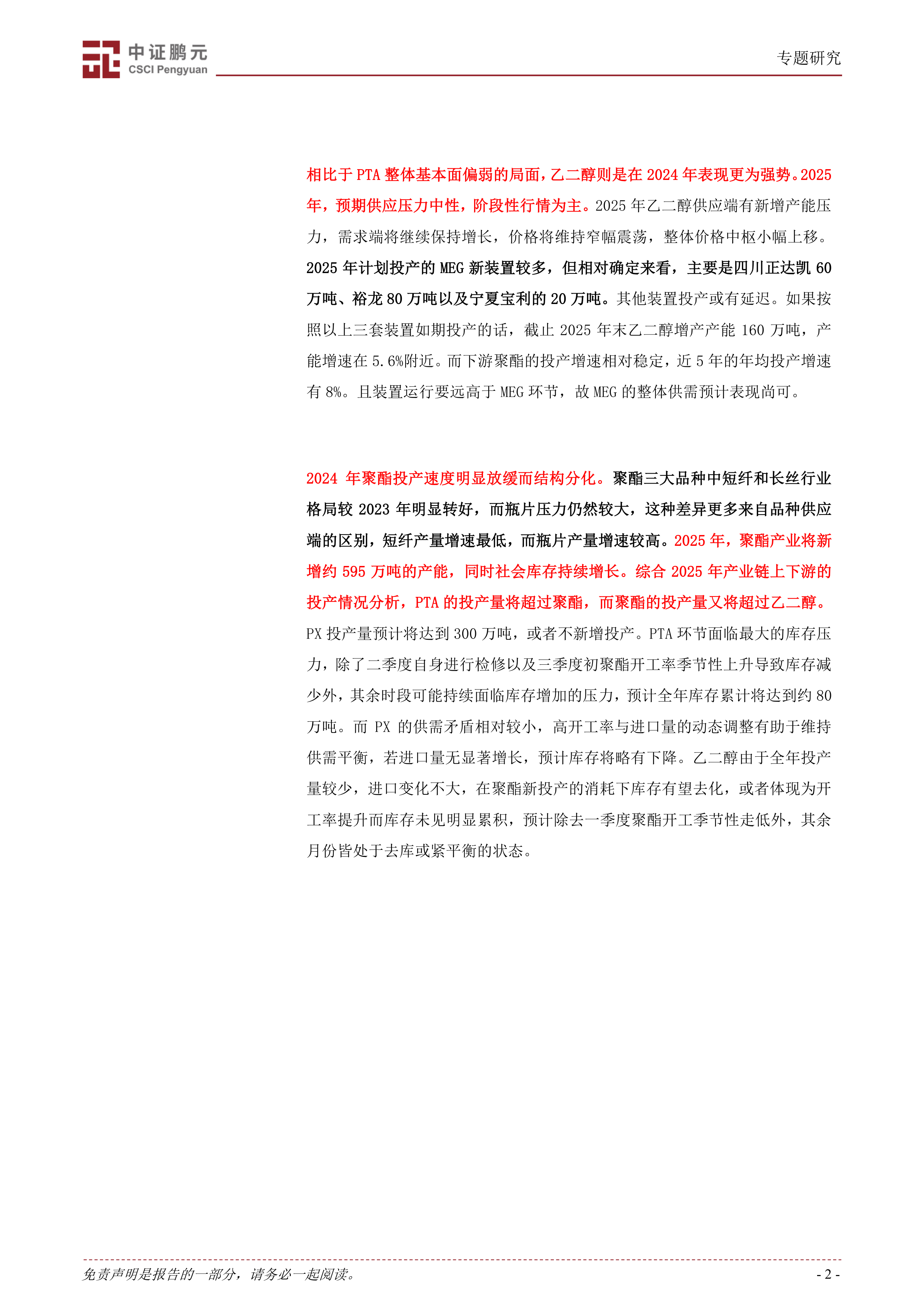 本报告的核心观点是:2025年聚酯产业链将面临供需格局的显著分化,PTA产能过剩压力巨大,而PX和乙二醇供需相对平衡,聚酯品种间也存在差异,瓶片产能过剩,长丝和短纤相对稳定。 具体而言,报告从PX、PTA、乙二醇及聚酯四个环节分别分析了2025年的供需预期、产能投放计划以及价格走势,并对未来市场走势进行了预测。