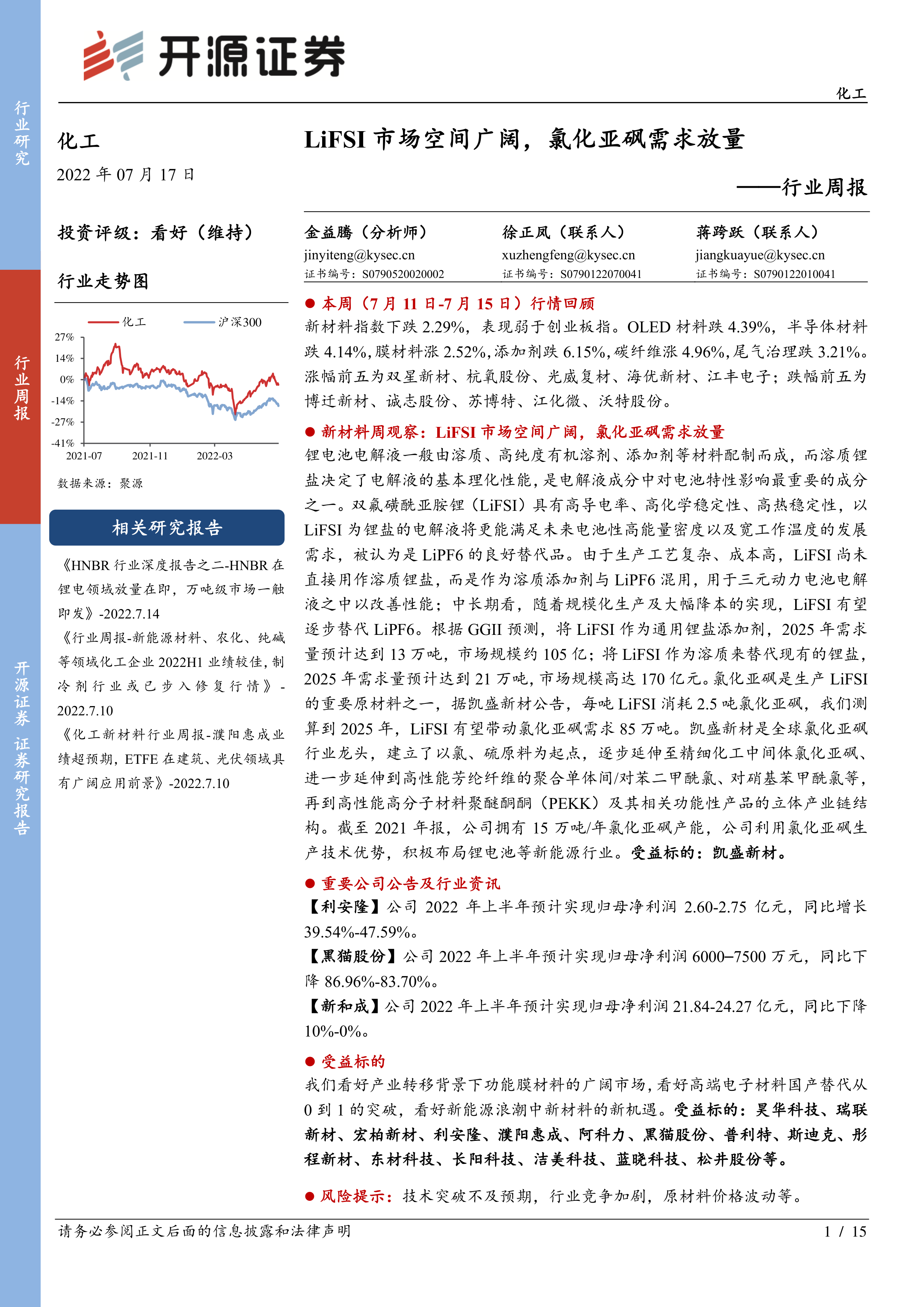 化工行业周报:LiFSI市场空间广阔,氯化亚砜需求放量