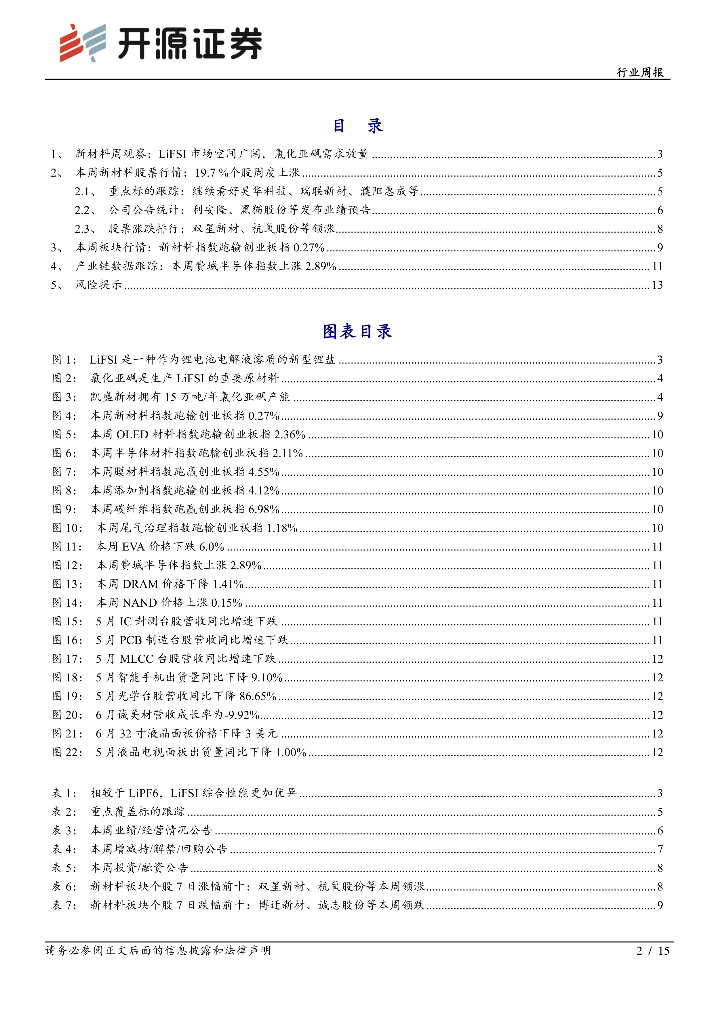 本报告通过对LiFSI市场前景、氯化亚砜需求以及本周新材料行业整体表现的分析,指出LiFSI市场空间广阔,将带动氯化亚砜需求快速增长,凯盛新材等相关企业将显著受益。同时,报告也对本周新材料行业股票行情、重点公司业绩以及产业链数据进行了跟踪分析,并提示了投资风险。 投资者需结合自身情况,谨慎决策。