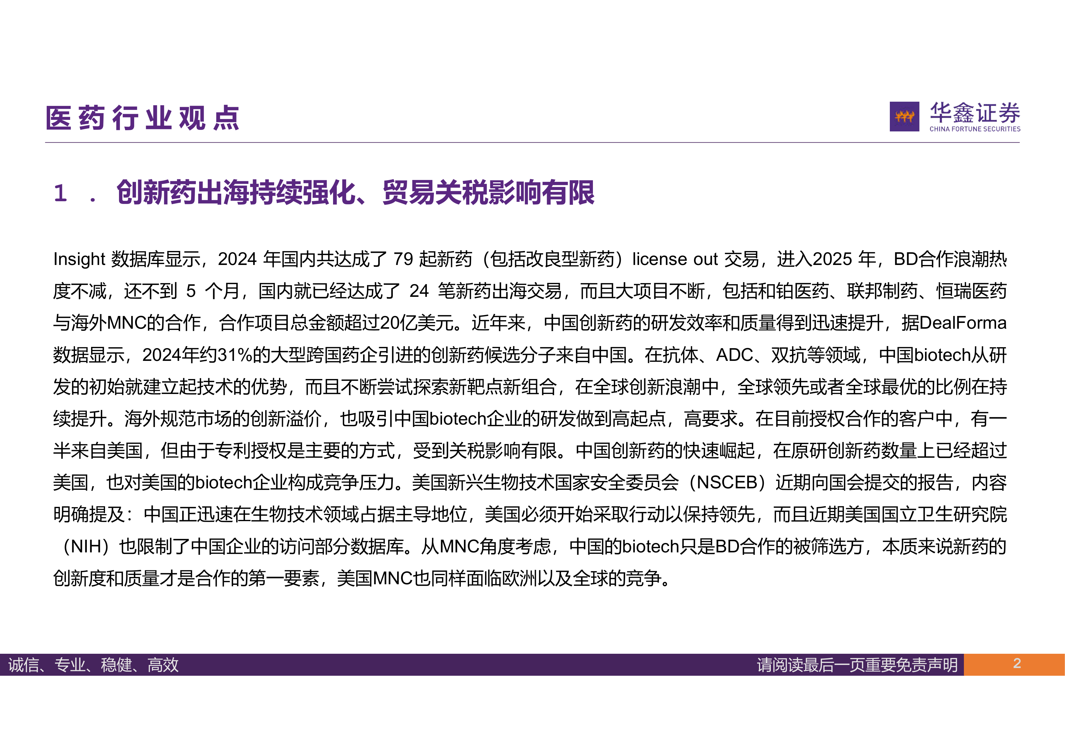 Insight数据库显示,2024年国内共达成了79起新药(包括改良型新药)license out交易,进入2025年,BD合作浪潮热度不减,还不到5个月,国内就已经达成了24笔新药出海交易,而且大项目不断,包括和铂医药、联邦制药、恒瑞医药与海外MNC的合作,合作项目总金额超过20亿美元。近年来,中国创新药的研发效率和质量得到迅速提升,据DealForma数据显示,2024年约31%的大型跨国药企引进的创新药候选分子来自中国。在抗体、ADC、双抗等领域,中国biotech从研发的初始就建立起技术的优势,而且不断尝试探索新靶点新组合,在全球创新浪潮中,全球领先或者全球最优的比例在持续提升。海外规范市场的创新溢价,也吸引中国biotech企业的研发做到高起点,高要求。在目前授权合作的客户中,有一半来自美国,但由于专利授权是主要的方式,受到关税影响有限。中国创新药的快速崛起,在原研创新药数量上已经超过美国,也对美国的biotech企业构成竞争压力。美国新兴生物技术国家安全委员会(NSCEB)近期向国会提交的报告,内容明确提及:中国正迅速在生物技术领域占据主导地位,美国必须开始采取行动以保持领先,而且近期美国国立卫生研究院(NIH)也限制了中国企业的访问部分数据库。从MNC角度考虑,中国的biotech只是BD合作的被筛选方,本质来说新药的创新度和质量才是合作的第一要素,美国MNC也同样面临欧洲以及全球的竞争。