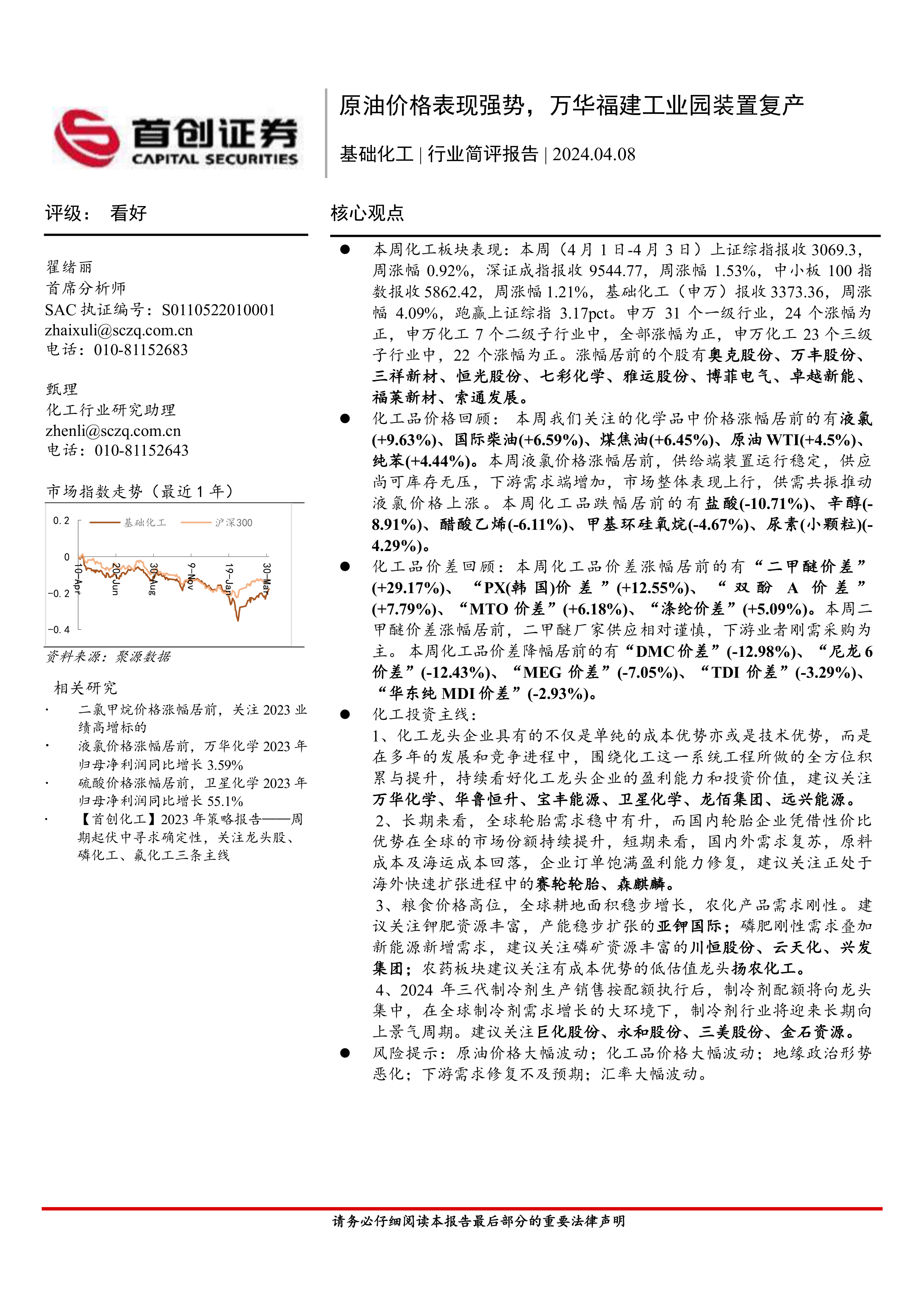 基础化工行业简评报告:原油价格表现强势,万华福建工业园装置复产