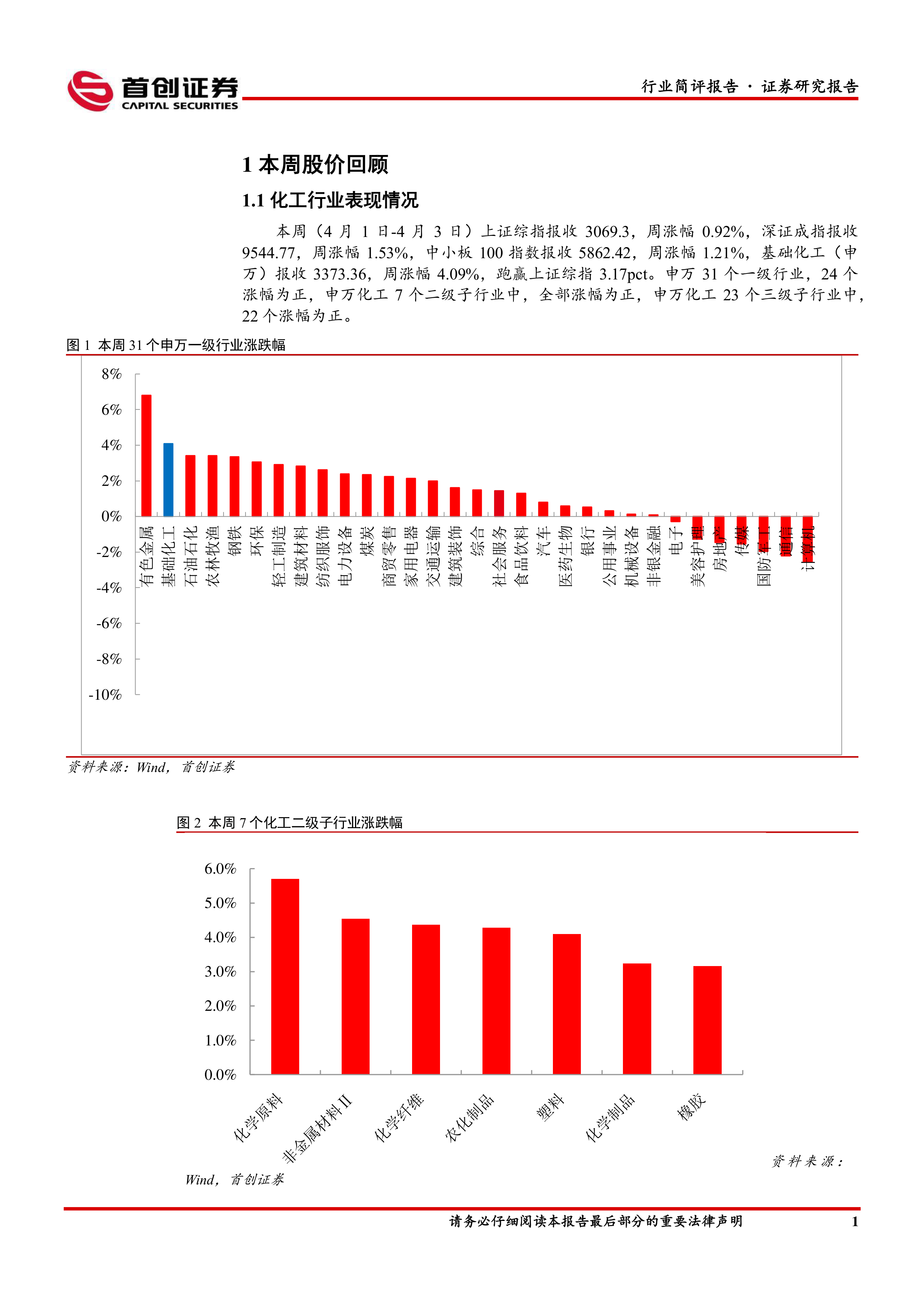 本周化工板块表现:本周(4月1日-4月3日)上证综指报收3069.3,周涨幅0.92%,深证成指报收9544.77,周涨幅1.53%,中小板100指数报收5862.42,周涨幅1.21%,基础化工(申万)报收3373.36,周涨幅4.09%,跑赢上证综指3.17pct。申万31个一级行业,24个涨幅为正,申万化工7个二级子行业中,全部涨幅为正,申万化工23个三级子行业中,22个涨幅为正。涨幅居前的个股有奥克股份、万丰股份、三祥新材、恒光股份、七彩化学、雅运股份、博菲电气、卓越新能、福莱新材、索通发展。