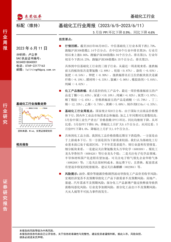 基础化工行业周报:5月份PPI环比下降0.9%、同比下降4.6%