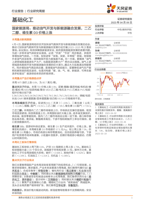 基础化工行业研究周报:国家能源局:推动油气开发与新能源融合发展,二乙二醇、维生素D3价格上涨