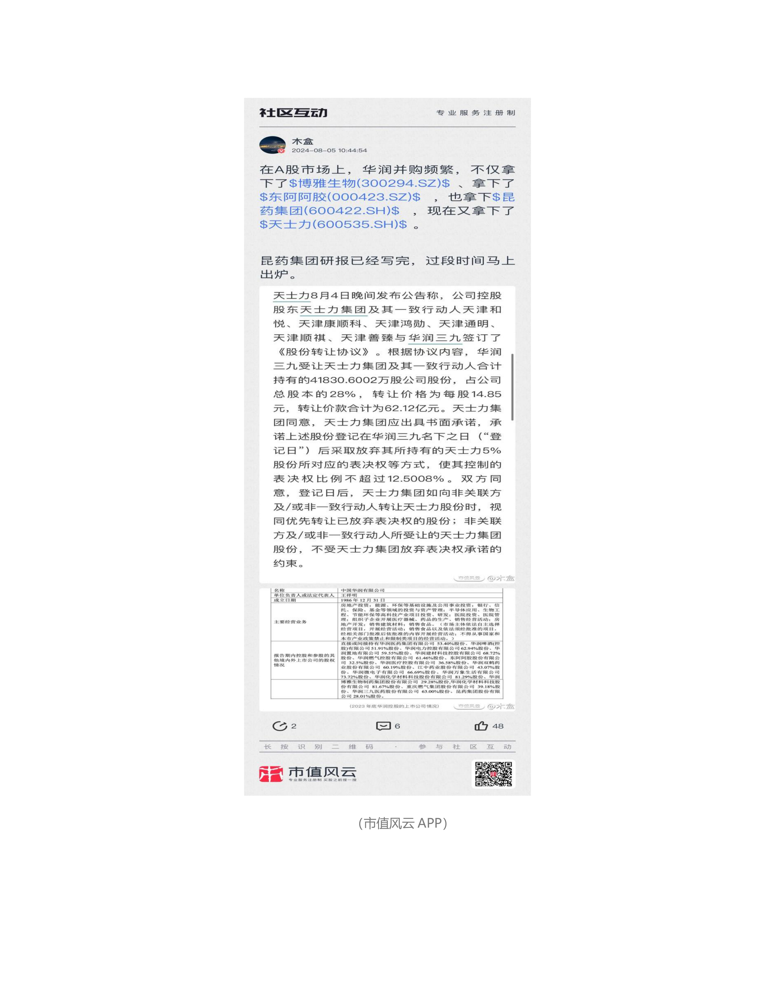 这件事震惊市场,因为这已经不是华润医药(3320.HK) 第一次并购 A 股上市公司,在风云君的印象中这几年一直并购频发,此前已经拿下博雅生物、东阿阿胶、昆药集团等上市公司的控制权