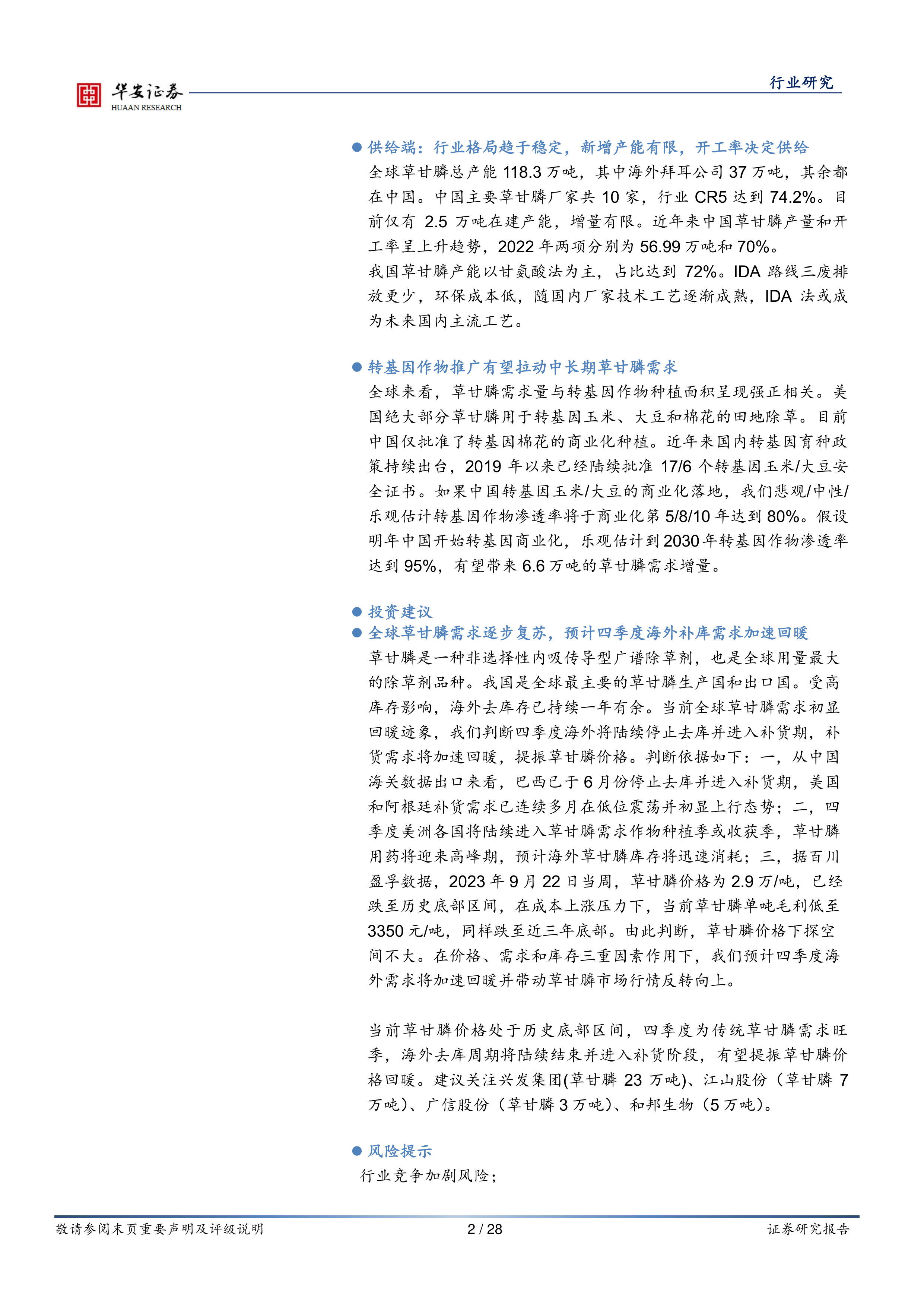 报告最后给出了投资建议,推荐关注兴发集团、和邦生物、江山股份等草甘膦行业头部企业,并提示了行业竞争加剧、原材料价格波动、产品价格大幅波动以及装置不可抗力等风险。