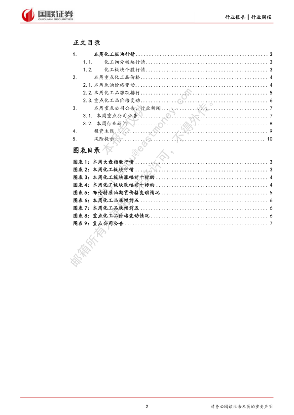 本报告的核心观点是:尽管本周化工板块整体下跌,但国际油价反弹以及部分化工品价格回暖,显示出化工行业长期向好的发展前景。报告维持对化工行业的“强于大市”评级,并推荐了一系列受益于疫情防控放开、内循环发展以及新能源赛道的投资标的。