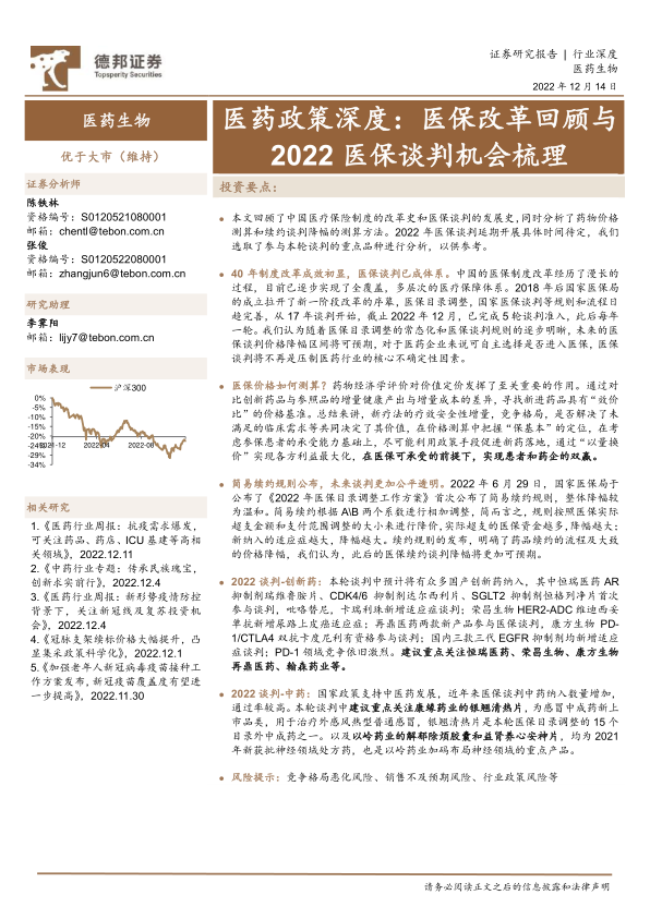 本文回顾了中国医疗保险制度的改革史和医保谈判的发展史,同时分析了药物价格测算和续约谈判降幅的测算方法。2022年医保谈判延期开展具体时间待定,我们选取了参与本轮谈判的重点品种进行分析,以供参考。