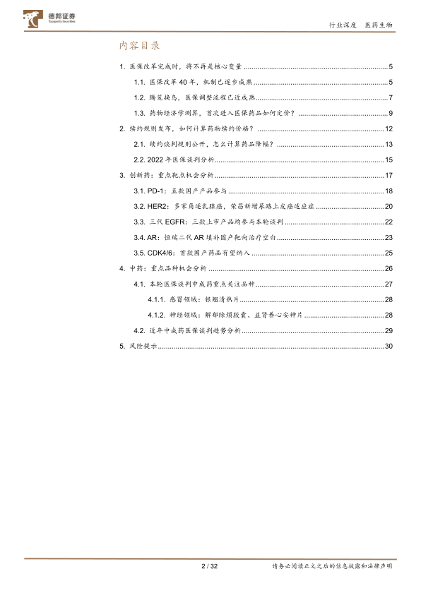 本报告的核心观点是:中国医疗保险制度改革已进入成熟阶段,医保谈判机制日趋完善,价格降幅区间可预期,医保谈判对医药行业的影响将逐渐减弱,不再是压制行业发展的核心不确定性因素。报告通过对医保改革历史、医保谈判规则、药物经济学测算方法以及2022年医保谈判重点品种的分析,得出上述结论,并为医药企业提供参考。