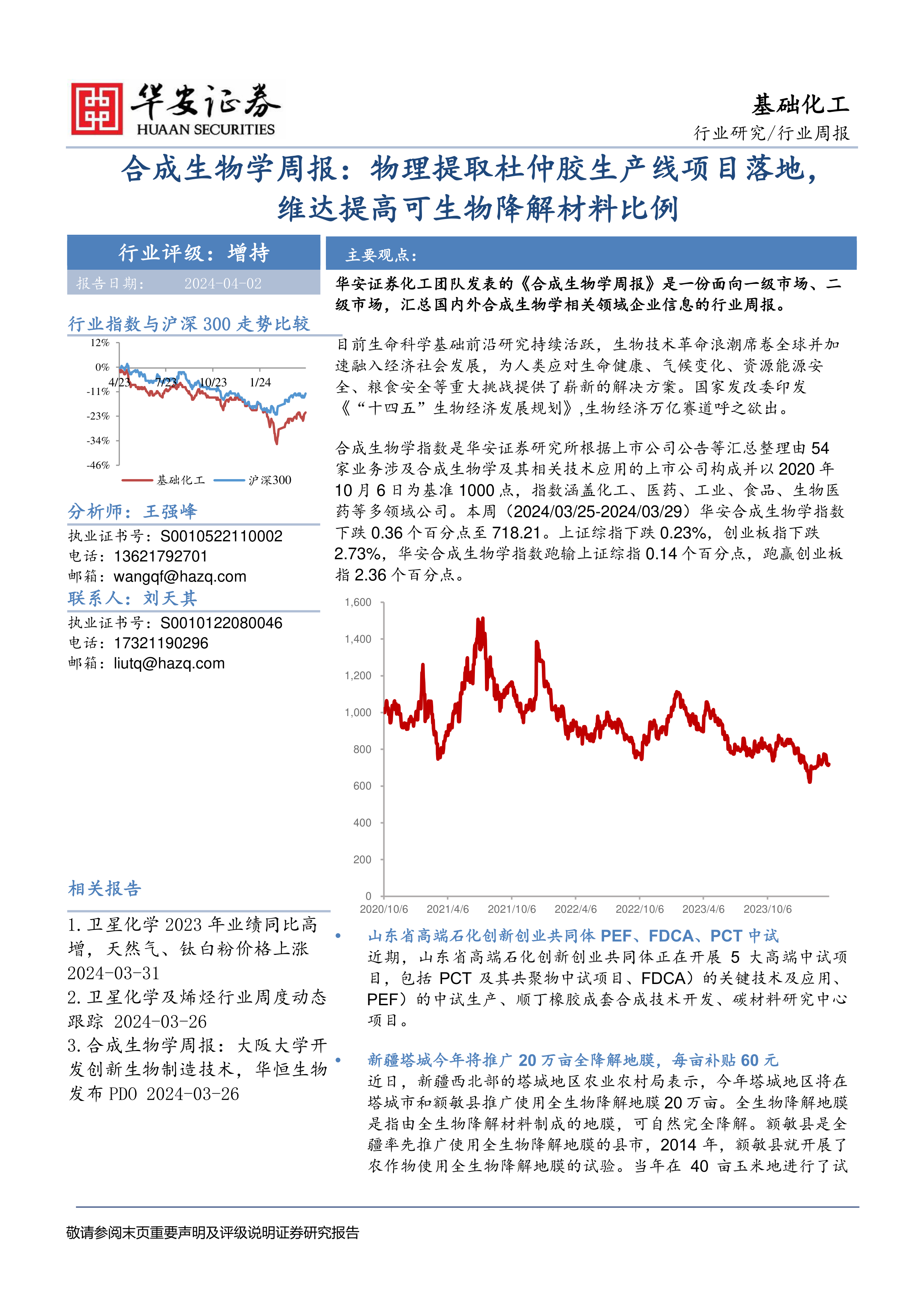 合成生物学指数是华安证券研究所根据上市公司公告等汇总整理由 54家业务涉及合成生物学及其相关技术应用的上市公司构成并以 2020 年10 月 6 日为基准 1000 点,指数涵盖化工、医药、工业、食品、生物医药等多领域公司。本周(2024/03/25-2024/03/29)华安合成生物学指数下跌 0.36 个百分点至 718.21。上证综指下跌 0.23%,创业板指下跌2.73%,华安合成生物学指数跑输上证综指 0.14 个百分点,跑赢创业板指 2.36 个百分点。