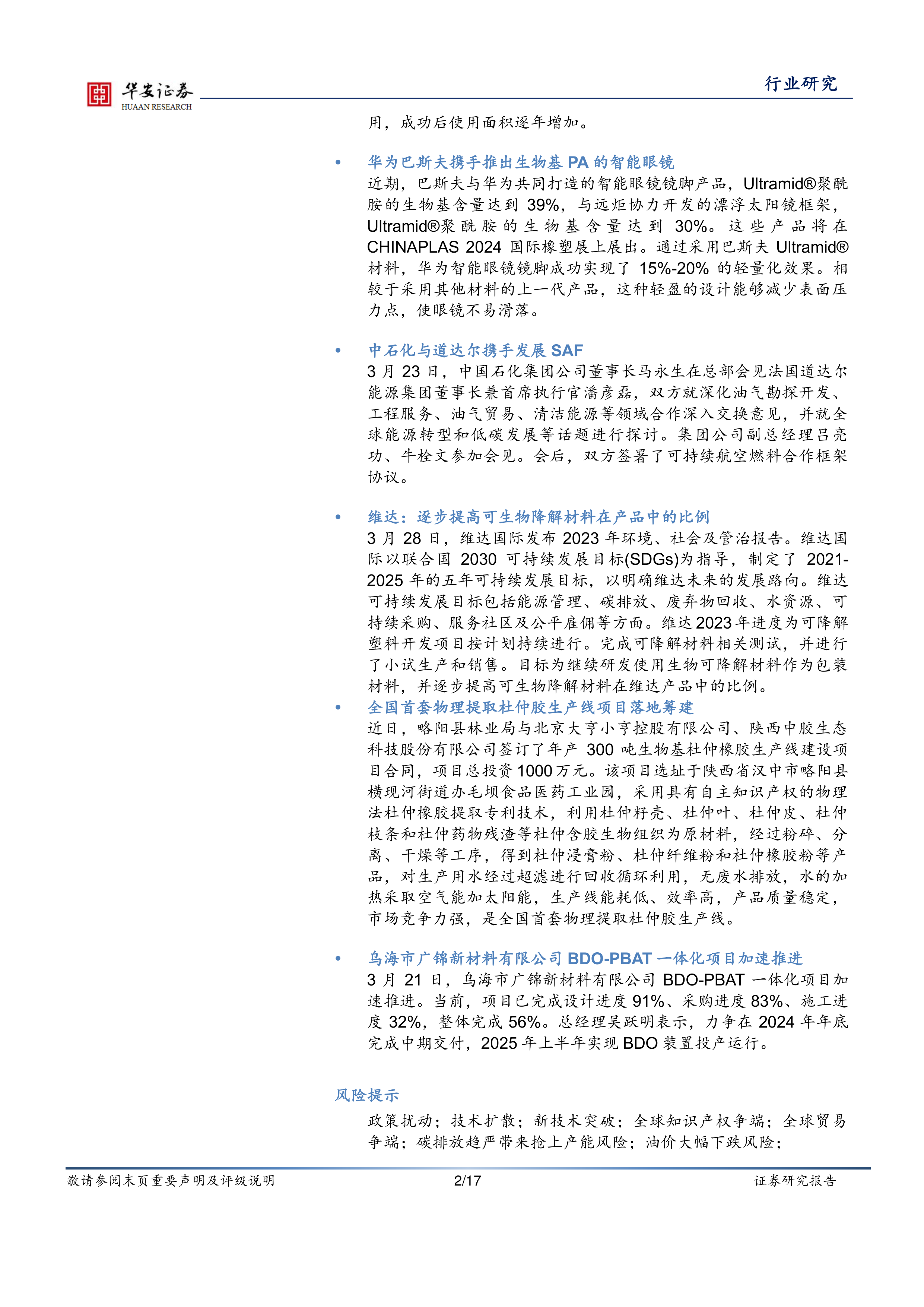 国外公司方面:陶氏推出新型生物基丙二醇解决方案;Sappi North America与Biophilica合作开发生物基皮革产品;中石化与道达尔携手发展SAF;维达国际逐步提高可生物降解材料在产品中的比例;全国首套物理提取杜仲胶生产线项目落地。