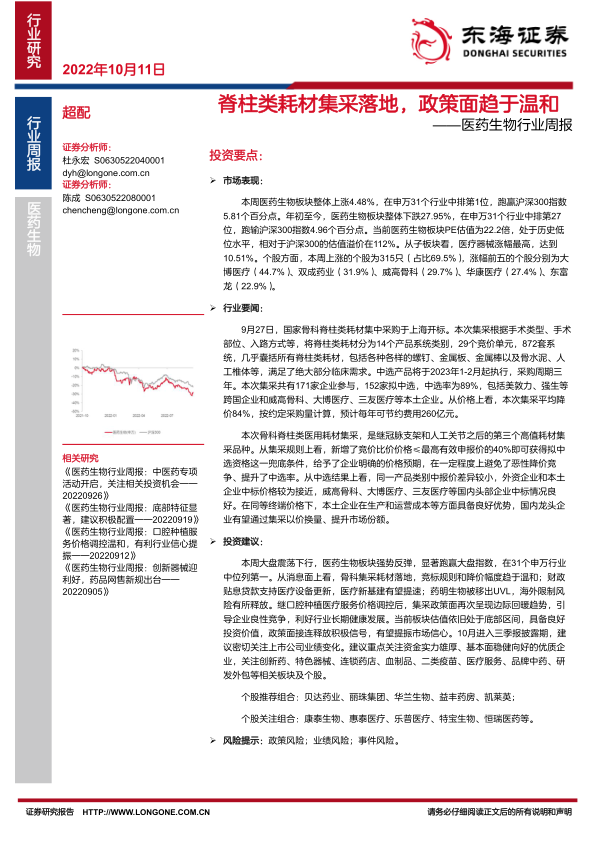医药生物行业周报:脊柱类耗材集采落地,政策面趋于温和