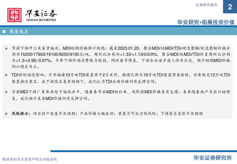 目前MDI下游厂家库存处于偏低水平,随着春节后MDI的补库,现阶段MDI价格具有支撑。未来随着地产及出行链修复,我们预计未来MDI价格仍有反弹空间。