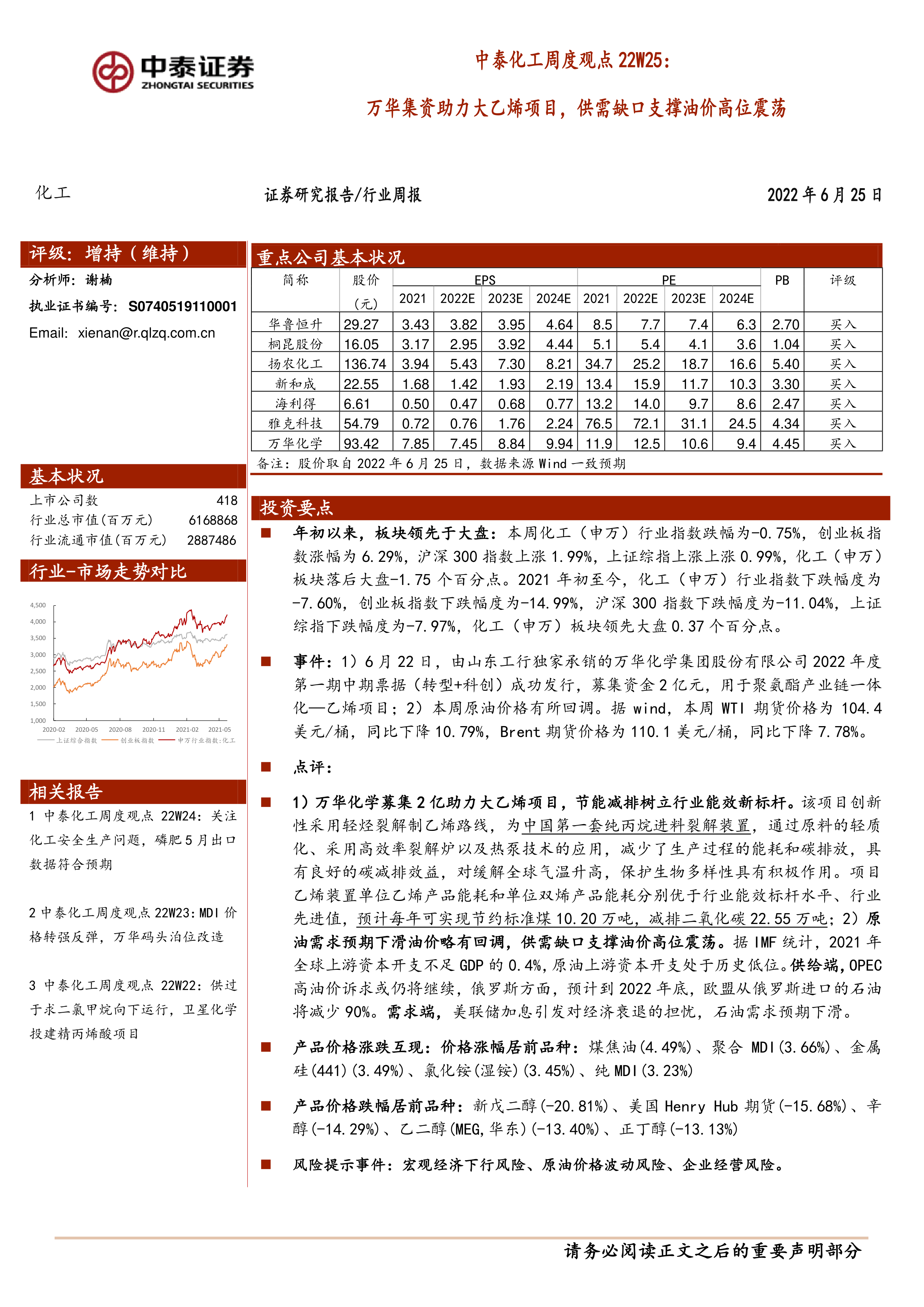 中泰化工周度观点22W25:万华集资助力大乙烯项目,供需缺口支撑油价高位震荡