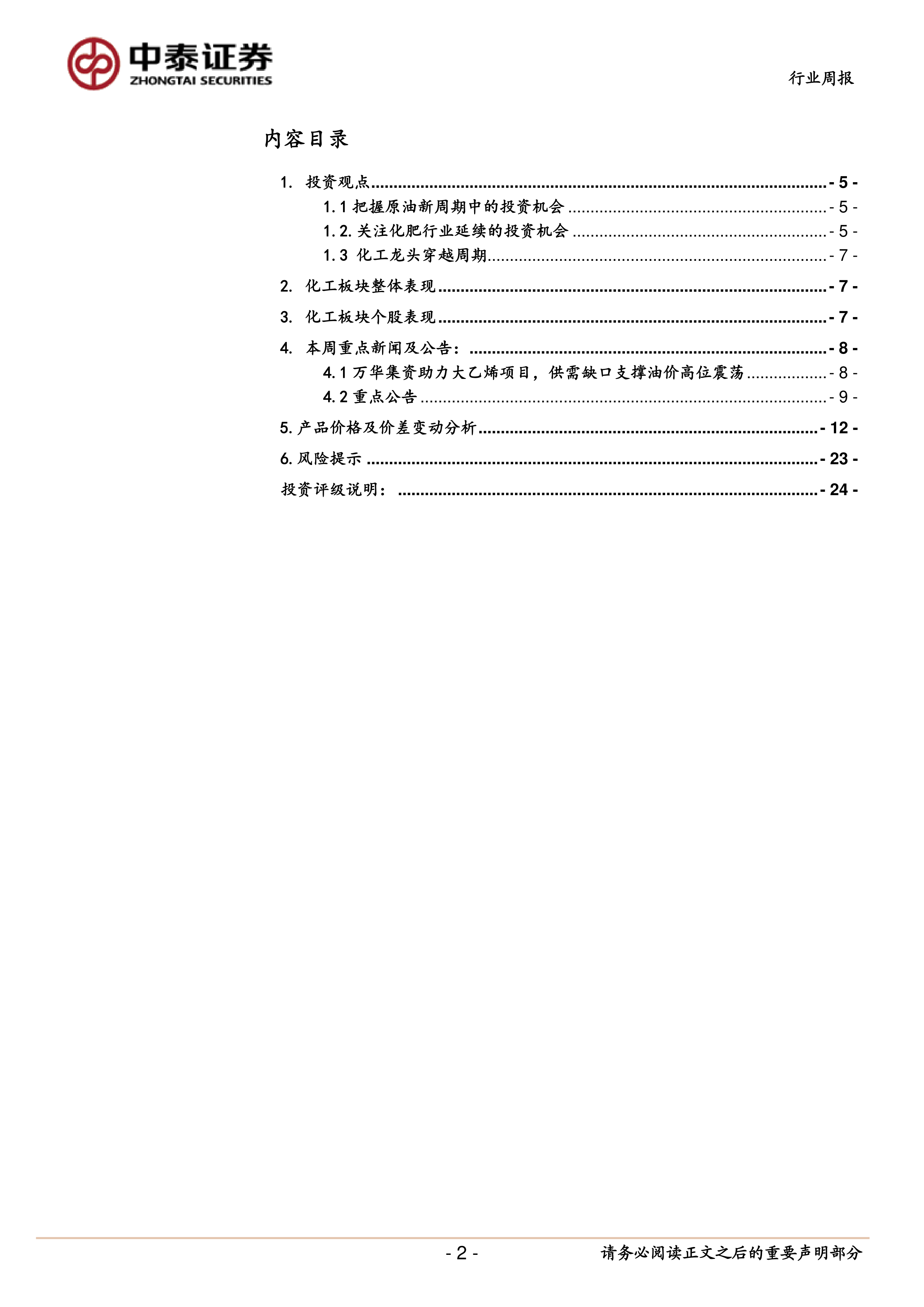 本报告的核心观点是:全球原油进入新周期,供需缺口支撑油价高位震荡;化肥行业景气度持续,全球供应紧张;化工龙头企业凭借其核心竞争力,有望穿越周期。 具体而言: