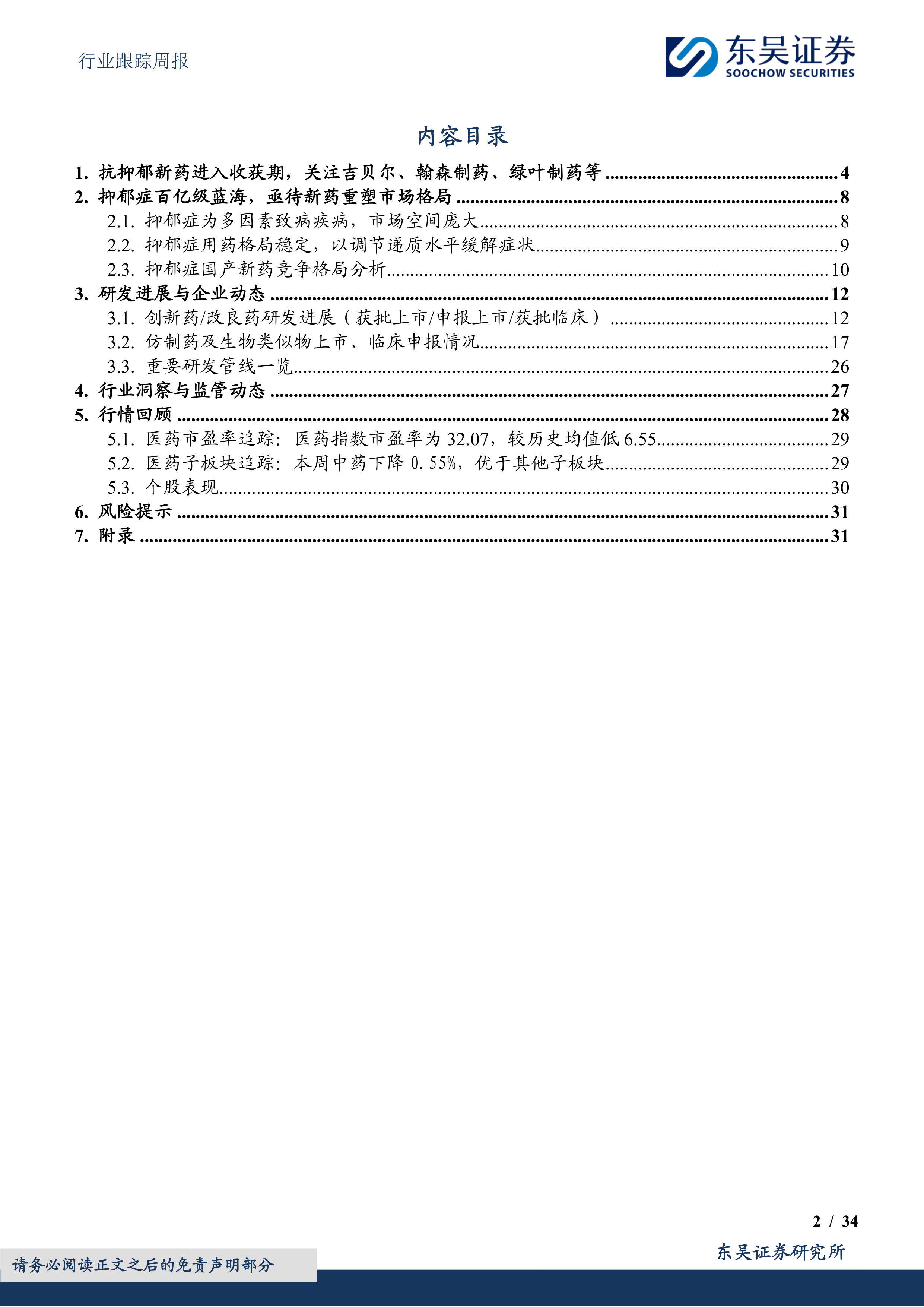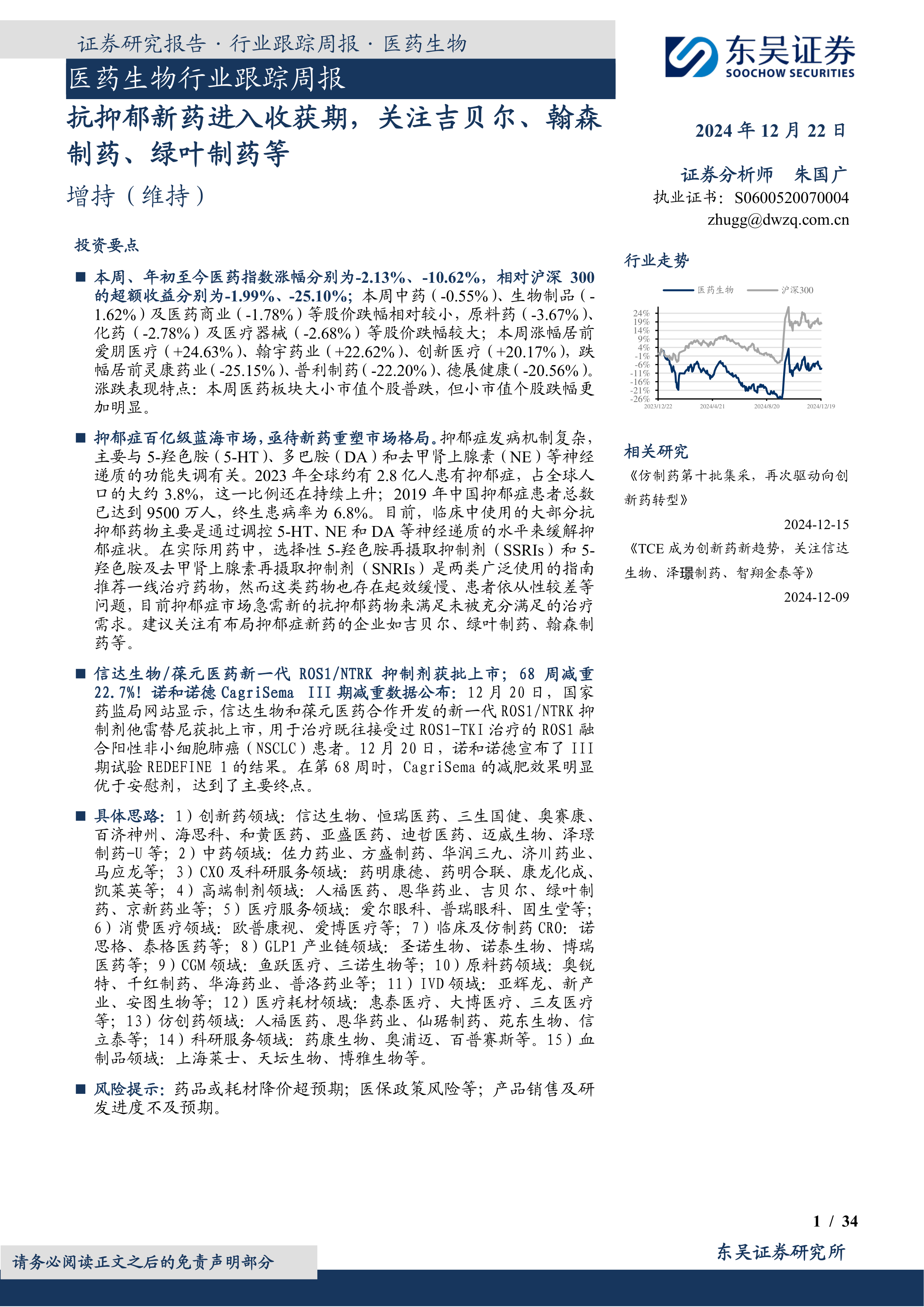 本报告的核心观点是:抗抑郁新药市场潜力巨大,亟待新药重塑市场格局。目前市场上大部分抗抑郁药物存在起效缓慢、患者依从性差等问题,新型抗抑郁药物的研发和上市将带来巨大的市场机遇。报告重点关注吉贝尔、翰森制药和绿叶制药等布局抑郁症新药的企业。此外,报告还对医药生物行业整体市场表现、研发进展、监管动态以及投资策略进行了分析。